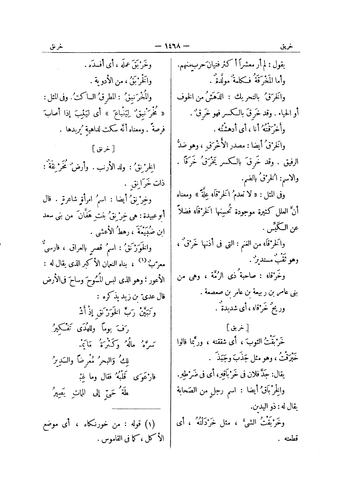 [خرنق] الخِرْنِقُ: ولد الأرنب. وأرضٌ مخرنقة: ذات خرانق. وخرنق أيضا: اسم امرأة شاعرة. قال أبو عبيدة: هي خرنق بنت هفان من بنى سعد ابن ضبيعة، رهط الاعشى. والخورنق: اسم قصر بالعراق، فارسي معرب (¬1) ، بناه النعمان الاكبر الذى يقال له: الاعور، وهو الذى لبس المسوح وساح في الارض قال عدى بن زيد يذكره: وتبين رب الخورنق إذ أش * رف يوما وللهدى تفكير سره ما له وكثرة ما يم * لك والبحر معرضا والسدير فارعوى قلبه فقال وما غبطة * حى إلى الممات يصير