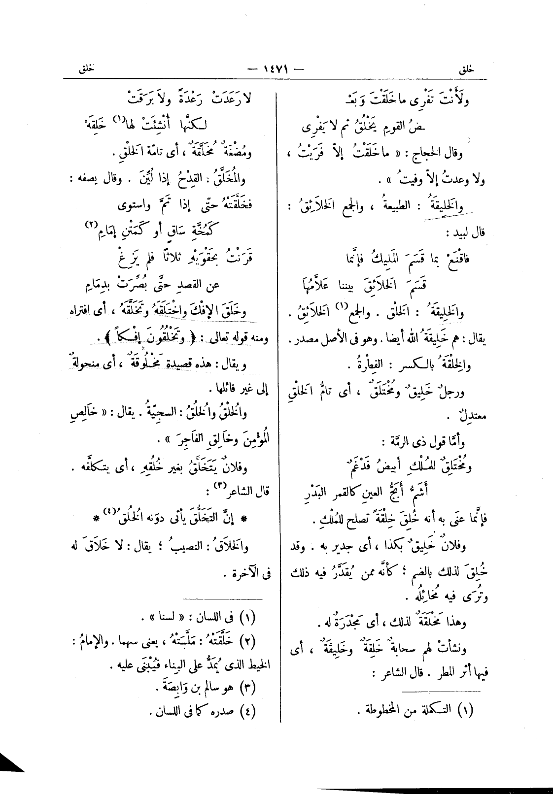 لارعدت رعدة ولابرقت لكنها أنشئت لها (¬1) خَلِقَهْ ومُضْغَةٌ مُخَلَّقَةٌ، أي تامّةُ الخَلْقِ. والمُخَلَّقُ: القِدْحُ إذا لين. وقال يصفه: فخلقته حتى إذا تم واستوى كمخة ساق أو كمتن إمام (¬2) قرنت بحَقْوَيْهِ ثلاثاً فلم يَزُغْ عن القصد حتى بصرت بدمام وخلق الافك واختلقه وتخلقه، أي افتراه ومنه قوله تعالى: {وتَخْلُقونَ إفْكاً} . ويقال: هذه قصيدة مَخْلوقَةٌ، أي منحولةٌ إلى غير قائلها. والخُلّقُ والخُلُقُ: السجِيّةُ. يقال: " خالِصِ المُؤْمِنَ وخالِقِ الفاجِرَ ". وفلانٌ يَتَخَلَّقُ بغير خُلُقِهِ، أي يتكلَّفه. قال الشاعر (¬3) :