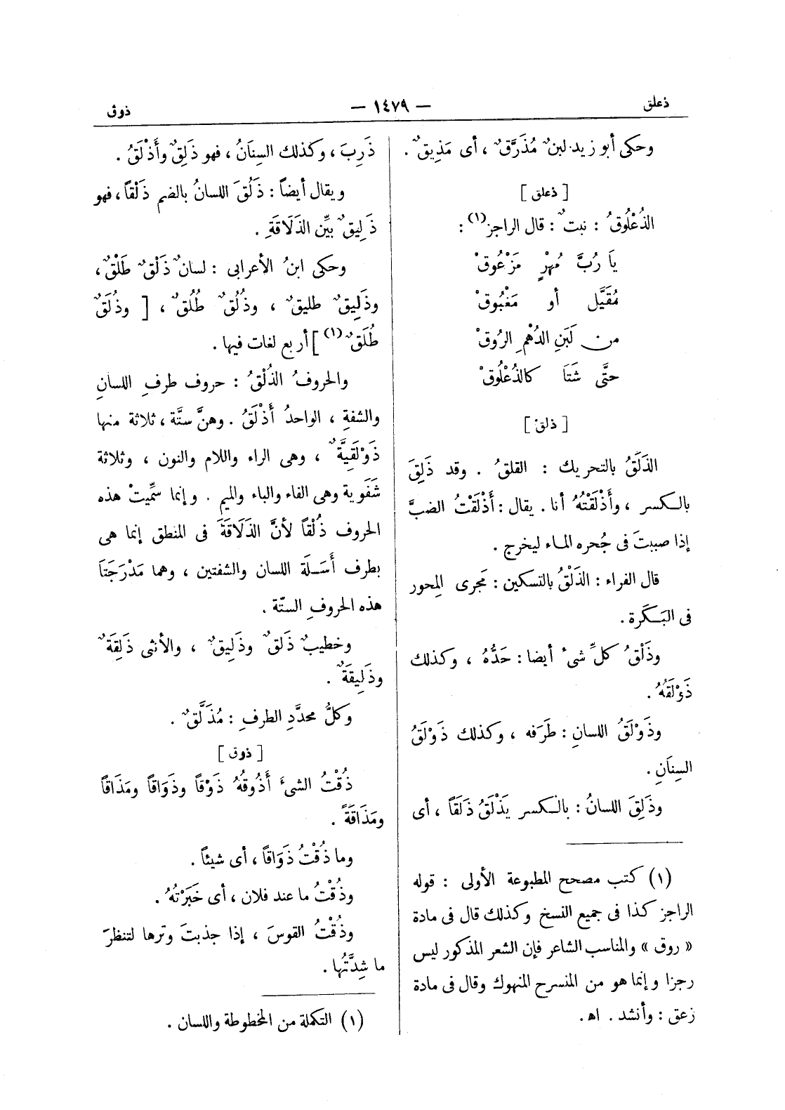[ذعلق] الذعلوق: نبت: قال الراجز (¬1) : يا رب مهر مزعوق مقيل أو مغبوق من لبن الدهم الروق حتى شتا كالذعلوق
