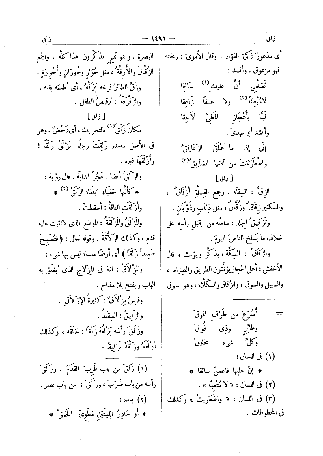 البصرة. وبنو تميم يذكرون هذا كله. والجمع الزقاق والازقة، مثل حوار وحوران وأحورة. وزق الطائر فرخه يزقه، أي أطعمه بفيه. والزقزقة: ترقيص الطفل.