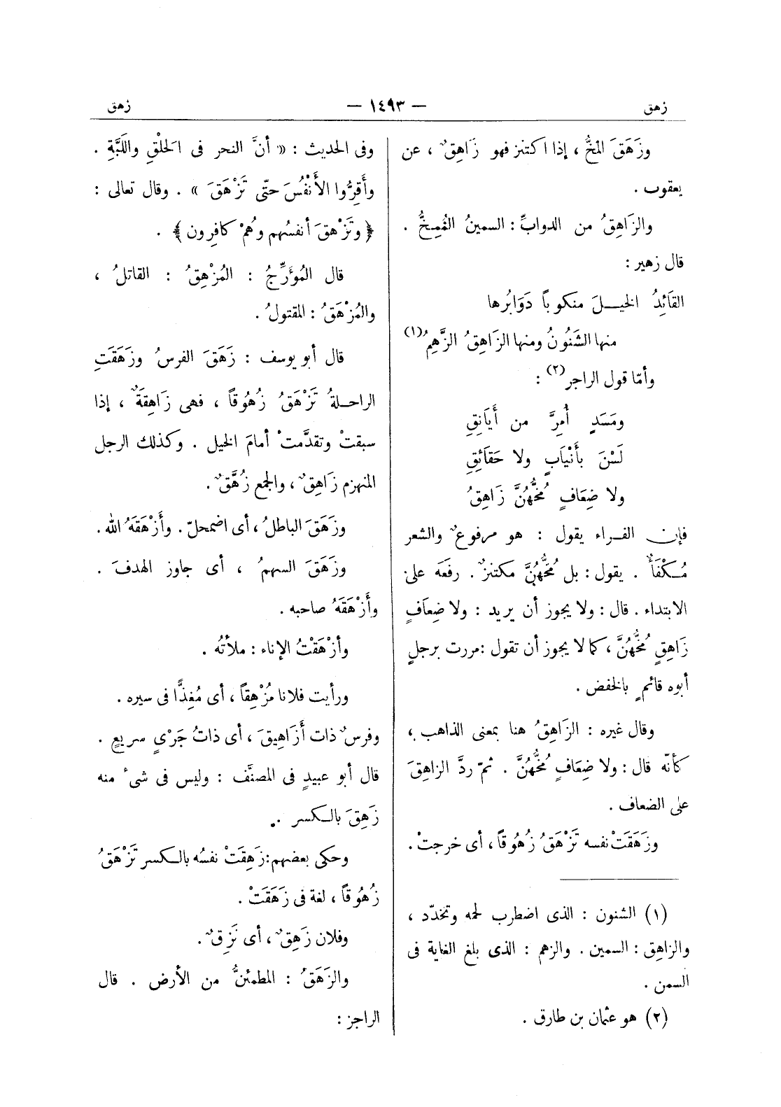 وزهق المخ، إذا اكتنز فهو زاهق، عن يعقوب. والزاهق من الدوابِّ: السمينُ المُمِخُّ. قال زهير: القائِدُ الخيلَ منكوباً دَوابرُها منها الشنون ومنها الزاهق الزهم (¬1) وأما قول الراجر (¬2) : ومسد أمر من أيانق لسن بأنياب ولا حقائق ولا ضعاف مخهن زاهق فإن الفراء يقول: هو مرفوع والشعر مكفا. يقول: بل محهن مكتنز. رفعه على الابتداء. قال: ولا يجوز أن يريد: ولا ضعاف زاهق مخهن، كما لا يجوز أن تقول: مررت برجل أبوه قائم بالخفض. وقال غيره: الزاهق هنا بمعنى الذاهب، كأنه قال: ولا ضعاف مخهن. ثم رد الزاهق على الضعاف. وزهقت نفسه تَزْهَقُ زُهوقاً، أي خرجتْ.