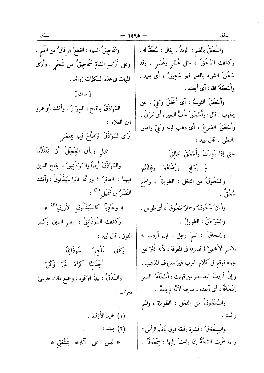 وحاديا كالسيذنوق الازرق (¬2) * وكذلك السوذانِقُ، بضم السين وكسر النون. قال لبيد: وكأني مُلْجِمٌ سوذانِقاً أجدليا كره غير وكل والسذق: ليلة الوقود، وجميع ذلك فارسي معرب.