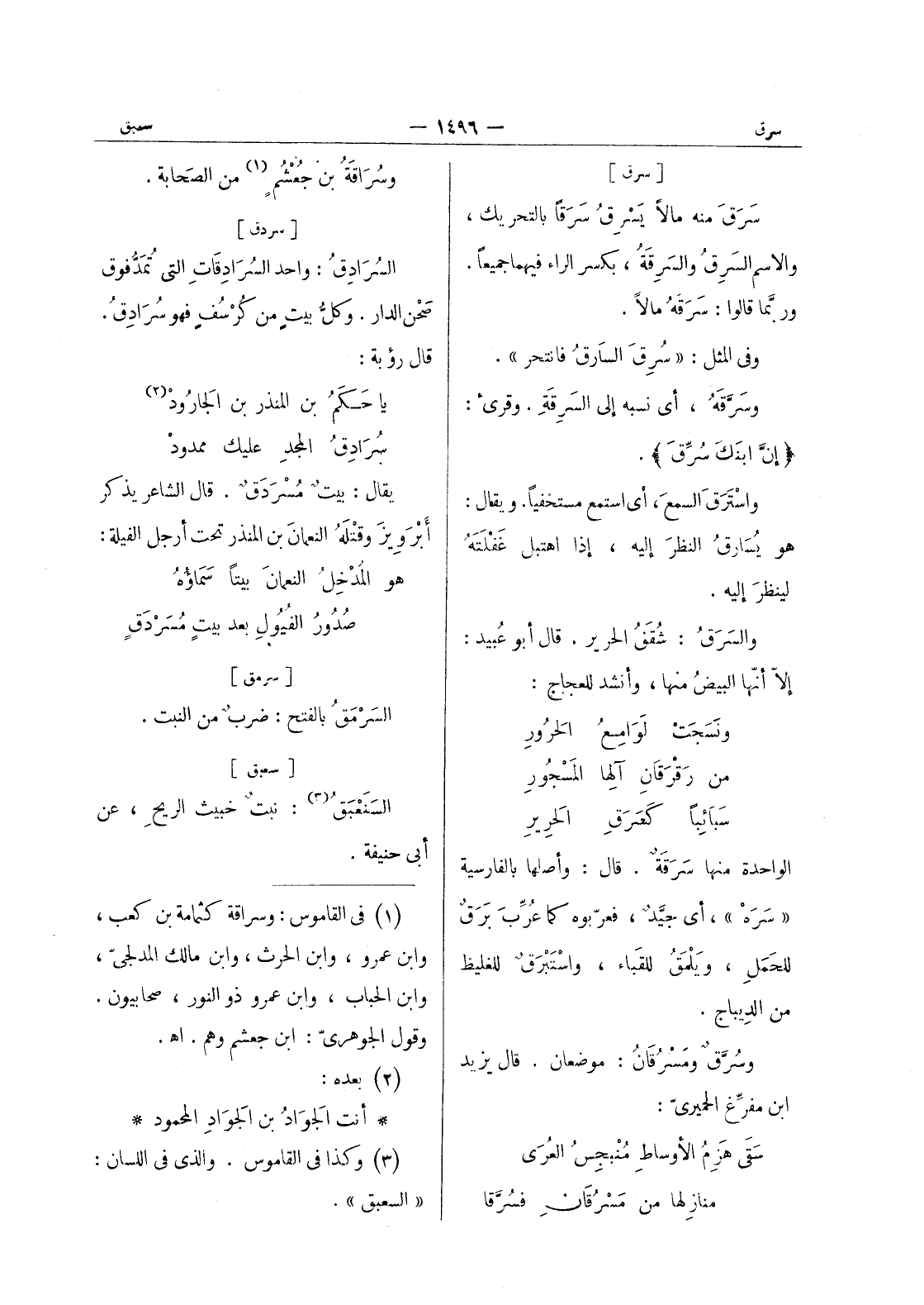 [سرق] سرق منه ما لا يسرق سَرَقاً بالتحريك، والاسم السَرِقُ والسَرِقَةُ، بكسر الراء فيهما جميعاً. وربَّما قالوا: سرقه ما لا. وفى المثل: " سرق السارق فانتحر ". وسرقه، أي نسبه إلى السرقة. وقرئ: {إن ابنك سرق} . واسترق السمع، أي استمع مستخفياً. ويقال: هو يُسارقُ النظرَ إليه، إذا اهتبل غفلته لينظر إليه. والسرق: شقف الحرير. قال أبو عُبيد: إلاّ أنها البيض منها، وأنشد للعجاج: ونسجت لوامع الحرور من رقرقان آلها المسجور سبائبا كصرق الحرير الواحدة منها سَرَقَةٌ. قال: وأصلها بالفارسية " سَرَهْ "، أي جيد، فعربوه كما عرب برق للحمل، ويلمق للقباء، واستبرق للغليظ من الديباج. وسرق ومسرقان: موضعان. قال يزيد ابن مفرغ الحميرى: سقى هزم الاوساط منجس العرى منازلها من مسرقان فسرقا