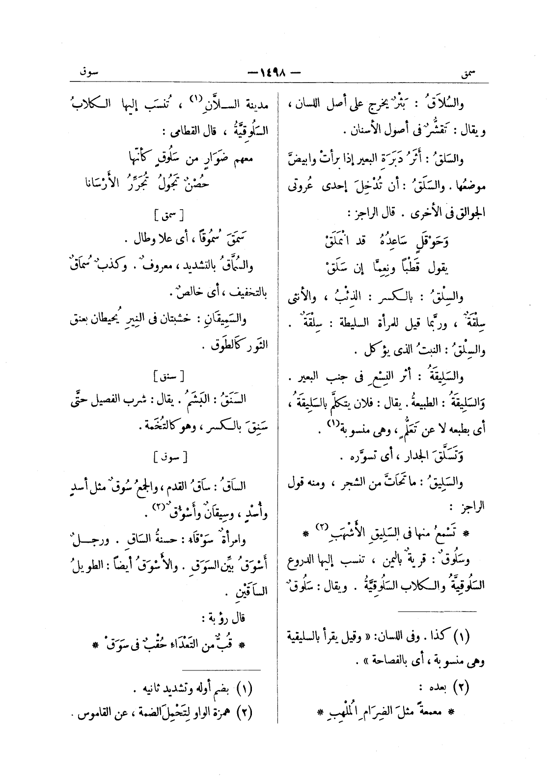 [سوق] الساقُ: ساقُ القدم والجمعُ سوق مثل أسد وأسد، وسيقان وأسؤق (¬2) . وامرأة سوقاء: حسنةُ السَاقِ. ورجلٌ أَسْوَقُ بيِّنُ السوق. والاسوق أيضا: الطويل الساقين. قال رؤبة: