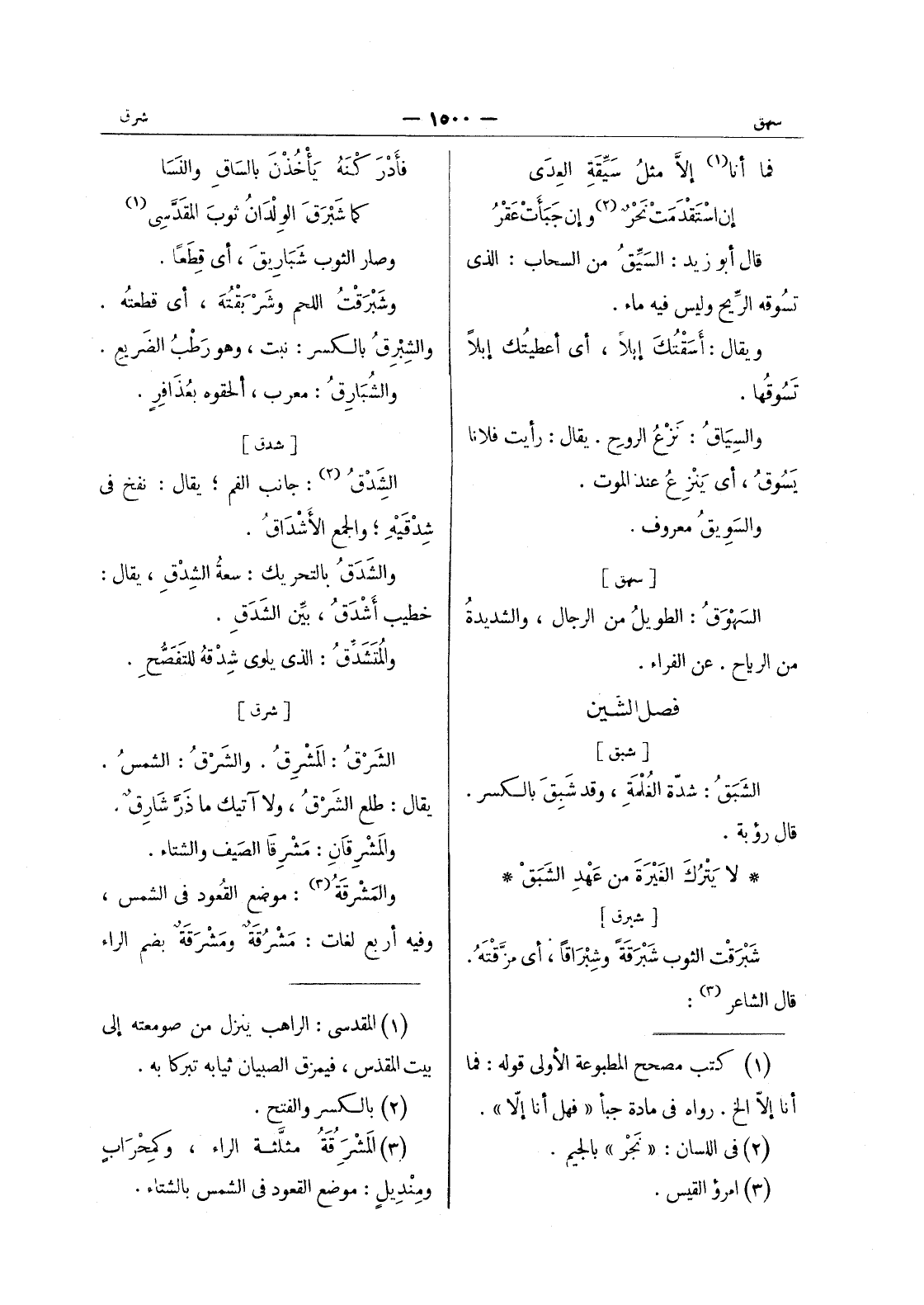 فأدر كنه يَأْخُذْنَ بالساقِ والنَسا كما شَبْرَقَ الوِلْدانُ ثوبَ المقَدَّسي (¬1) وصار الثوب شَباريقَ، أي قِطَعاً. وشَبْرَقْتُ اللحم وشربقته، أي قطعته. والشبرق بالكسر: نبت، وهو رطب الضريع. والشبارق: معرب، ألحقوه بعذافر.