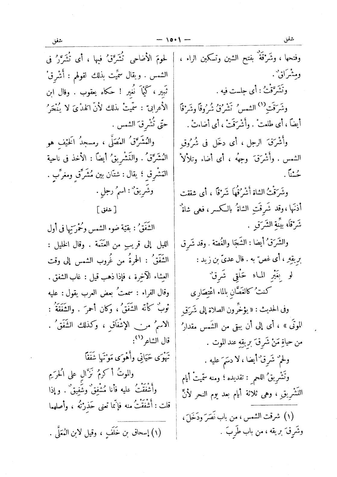 [شفق] الشَفَقُ: بقيّة ضوء الشمس وحُمْرَتِها في أول الليل إلى قريبٍ من العَتَمة. وقال الخليل: الشَفَقُ: الحمرةُ من غُروب الشمس إلى وقت العِشاء الآخِرة، فإذا ذهب قيل: غاب الشفق. وقال الفراء: سمعتُ بعض العرب يقول: عليه ثوبٌ كأنّه الشَفَقُ، وكان أحمرَ. والشَفَقَةُ: الاسمُ من الإشْفاقِ، وكذلك الشَفَقُ. قال الشاعر (¬1) : تَهْوى حَياتي وأَهْوى مَوْتَها شَفَقاً والموتُ أكرمُ نَزَّالٍ على الحُرَمِ وأشفقت عليه فأنا مشفق وشفيق. وإذا قلت: أشفقت منه فإنما تعنى حذرته، وأصلهما
