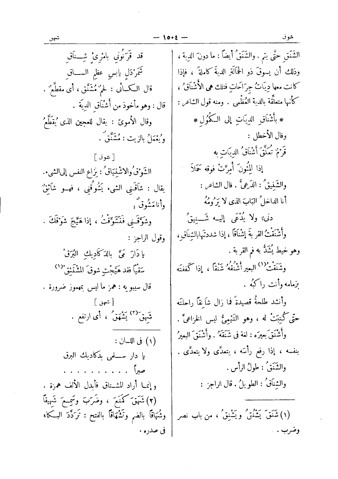 بأشناق الديات إلى الكمول * وقال الاخطل: قرم تُعَلَّقُ أَشْناقُ الدِياتِ به إذا المِئُونَ أُمِرَّتْ فوقه حَمَلا والشَنيقُ: الدَعِيُّ. قال الشاعر: أنا الداخلُ الباب الذى لا يرومه دنئ ولا يُدْعى إليه شَنيقُ وأَشْنَقْتُ القربة إشناقا، إذا شدد تها بالشناق، وهو خيط يشد به في القربة. وشَنَقْتُ (¬1) البعير أَشْنُقُهُ شَنْقاً، إذا كَففتَه بزمامه وأنت راكبُه. وأنشد طلحة قصيدة فما زال شانقا راحلته حتى كتبت له، وهو التيمى ليس الخزاعى. وأَشْنَقَ بعيرَه: لغة في شَنَقَهُ. وأَشْنَقَ البعيرُ بنفسه، إذا رفع رأسَه، يتعدَّى ولا يتعدّى. والشَنَقُ: طولُ الرأس. والشِناقُ: الطويلُ. قال الراجز