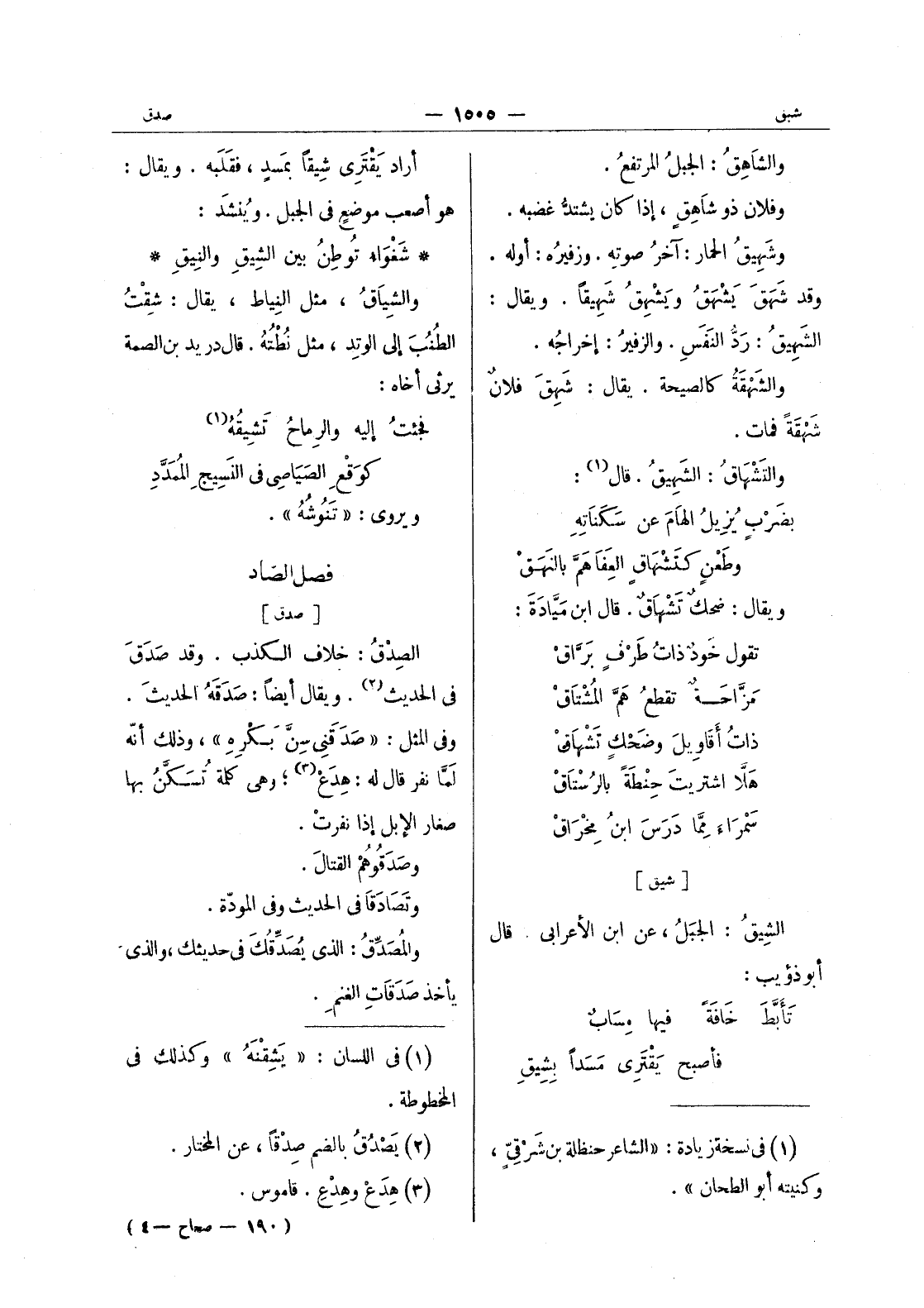 والشاهِقُ: الجبلُ المرتفعُ. وفلان ذو شاهِقٍ، إذا كان يشتدُّ غضبه. وشَهيقُ الحمار: آخرُ صوتِه. وزفيرُه: أوله. وقد شَهَقَ يَشْهَقُ ويَشْهِقُ شهيقا. ويقال: الشهيق: رد النفس. والزفيرُ: إخراجُه. والشَهْقَةُ كالصيحة. يقال: شَهِقَ فلانٌ شَهْقَةً فمات. والتَشْهاقُ: الشَهيقُ. قال (¬1) : بضَرْبٍ يُزيلُ الهامَ عن سكناته وطعن كتشهاق العفاهم بالنهق ويقال: ضحك تشهاق. قال ابن ميادة: تقول خود ذات طرف براق مزاحة تقطع هم المشتاق ذات أقاويل وضحك تشهاق هلا اشتريت حنطة بالرستاق سمراء مما درس ابن مخراق