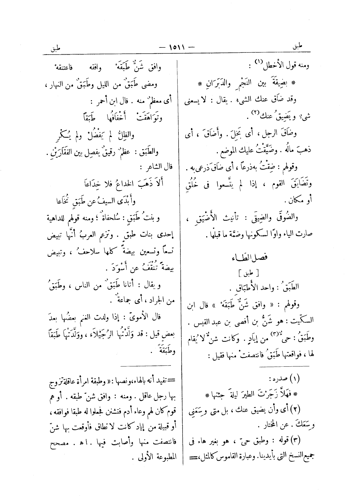 = تفيد أنه بالهاء، ونصها: " وطبقة امرأة عاقلة تزوج بها رجل عاقل. ومنه: وافق شن طبقه. أوهم قوم كان لهم وعاء أدم فتشنن فجعلوا له طبقا فوافقه، أو قبيلة من إياد كانت لا تطاق فأوقعت بها شن فانتصفت منها وأصابت فيها. اه. مصحح المطبوعة الاولى.