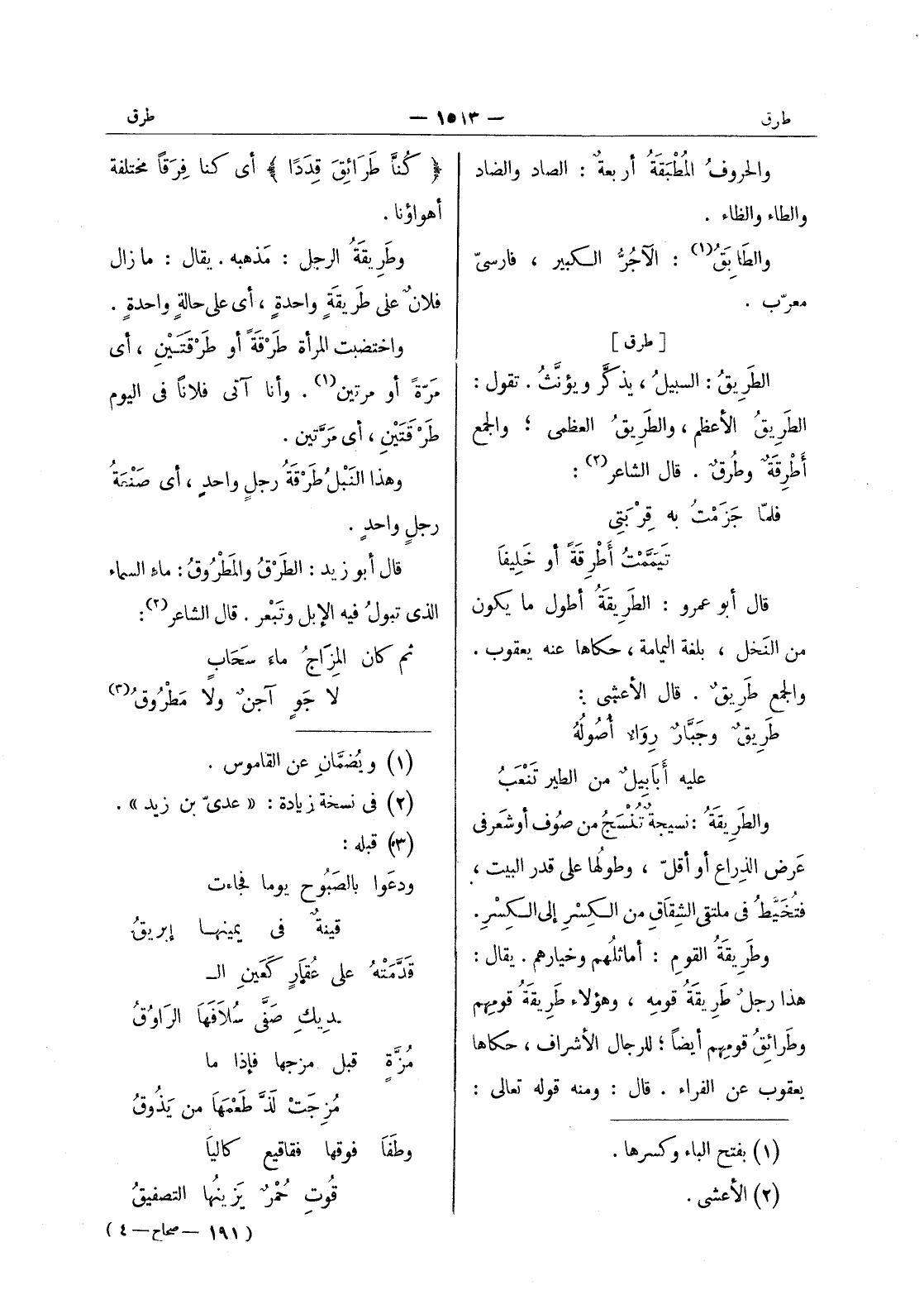 [طرق] الطَريقُ: السبيلُ، يذكَّر ويؤنَّثُ. تقول: الطَريقُ الأعظم، والطَريقُ العظمى، والجمع أَطْرِقَةٌ وطُرقٌ. قال الشاعر (¬2) : فلمّا جَزَمْتُ به قِرْبَتي تَيَمَّمْتُ أَطْرِقَةً أو خَليفا قال أبو عمرو: الطَريقَةُ أطول ما يكون من النَخل، بلغة اليمامة، حكاها عنه يعقوب. والجمع طَريقٌ. قال الأعشى: طَريقٌ وجَبَّارٌ رِواءٌ أُصولُهُ عليه أبابيلٌ من الطير تَنْعَبُ والطَريقَةُ: نسيجةٌ تُنْسَجُ من صوف أو شَعر في عَرض الذِراع أو أقلّ، وطولُها على قدر البيت، فتُخَيَّطُ في ملتقى الشِقاقِ من الكِسْرِ إلى الكِسْرِ. وطَريقَةُ القوم: أماثلُهم وخيارهم. يقال: هذا رجلٌ طَريقَةُ قومِه، وهؤلاء طَريقَةُ قومِهم وطَرائِقُ قومِهم أيضاً، للرجال الأشراف، حكاها يعقوب عن الفراء. قال: ومنه قوله تعالى