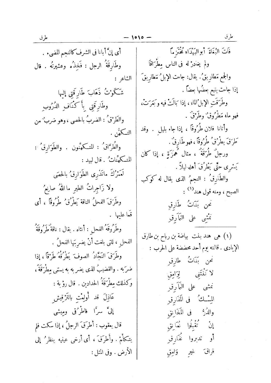 أي إن أبانا في الشرف كالنجم المضئ. وطارِقَةُ الرجل: فَخِذُه وعشيرته. قال الشاعر: شَكَوْتُ ذَهابَ طارِقَتي إليها وطارِقَتي بِأكْنَاف الدُروبِ والطَرْقُ: الضربُ بالحصى، وهو ضربٌ من التكهُّن. والطُرَّاق: المتكهِّنون. والطَوارِقُ: المتكهِّنات. قال لبيد: لَعَمْرُكَ ما تَدْري الطَوارِقُ بالحصى ولا زاجِراتُ الطيرِ ما الله صانِعُ وطَرَقَ الفحلُ الناقة يطْرُقُ طُروقاً، أي قَعا عليها. وطروقة الفحل: أنثاه. يقال: ناقد طَروقَةُ الفحلِ، للتي بلغت أن يضرِبَها الفحلُ. وطَرَقَ النجَّاد الصوفَ يطرقه طرقا، إذا ضربه. والضيب الذى يضربه به يسمى مطرفة، وكذلك مِطْرَقَةُ الحدادين. قال رؤبة: عاذل قد أولعت بالتَرْقيشِ إليَّ سِرًّا فاطْرُقي وَميشي قال يعقوب: أطرَقَ الرجلُ، إذا سكت فلم يتكلَّم. وأطرَقَ، أي أرخى عينيه ينظرُ إلى الأرض. وفي المثل:
