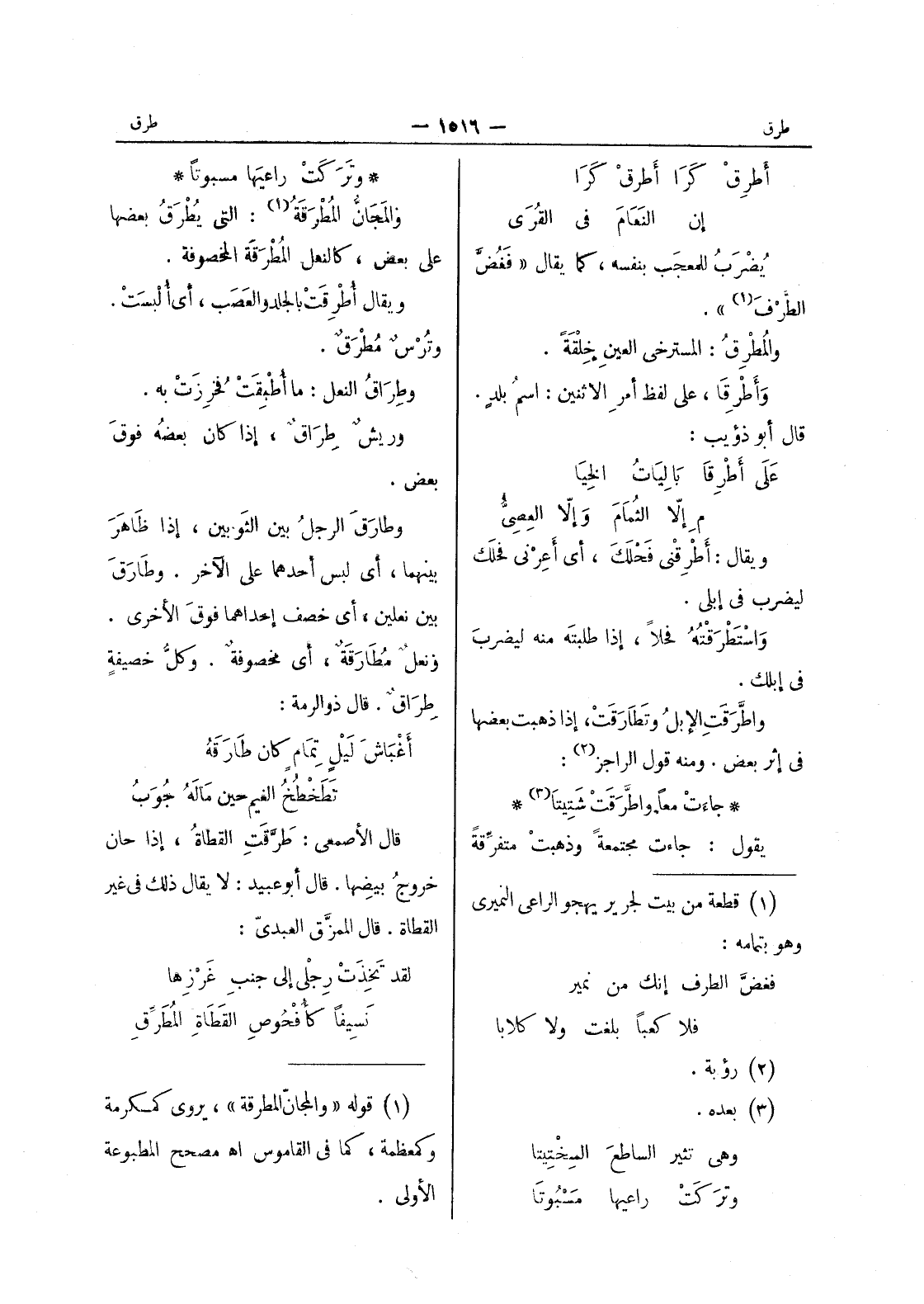 والمجان المطرقة (¬1) : التي يُطْرَقُ بعضها على بعض، كالنعل المُطْرَقَةَ المخصوفة. ويقال أُطْرِقَتْ بالجلد والعَصَب، أي أُلْبِست. وتُرْسٌ مُطْرَقٌ. وطِراقُ النعل: ما أُطْبِقَتْ فخُرِزَتْ به. وريشٌ طِراقٌ، إذا كان بعضه فوق بعض.. طارق الرجلُ بين الثَوبين، إذا ظاهَرَ بينهما، أي لبس أحدهما على الآخر. وطارَقَ بين نعلين، أي خصف إحداهما فوقَ الأخرى. ونعلٌ مُطارَقَةٌ، أي مخصوفةٌ. وكلُّ خصيفةٍ طراق. قال ذو الرمة: أغْباشَ ليلٍ تَمامٌ كان طارَقَه تطخطخ الغيم حين ما له جوب قال الاصمعي: طرقت القطاة، إذا حان خروجُ بيضِها. قال أبو عبيد: لا يقال ذلك في غير القطاة. قال الممزَّق العبدى: لقد تخذت رجل إلى جَنْبِ غَرْزِها نَسيفاً كأُفْحوصِ القطاة المطرق