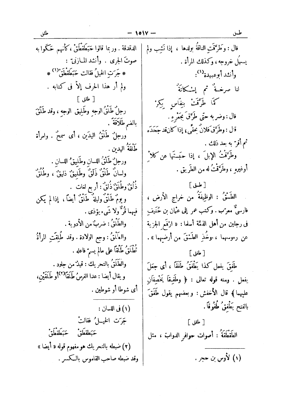 [طلق] رجلٌ طَلْقُ الوجهِ وطَليق الوجهِ، وقد طَلُقَ بالضم طَلاقَةً. ورجلٌ طَلْقُ اليدين، أي سمحٌ. وامرأة طَلْقَةُ اليدين. ورجلٌ طَلْقُ اللسانِ وطَليقُ اللسانِ. ولسانٌ طَلْقٌ ذُلقٌ وطَليقٌ ذليقٌ، وطُلُقٌ ذُلُقٌ وطُلَقٌ ذُلَقٌ: أربع لغات. ويومٌ طَلْقٌ وليلةٌ طَلْقٌ أيضاً، إذا لم يكن فيهما قر ولا شئ يؤذى. والطلق: ضرب من الأدوية. والطَلقُ: وجع الولادة. وقد طُلِقَتِ المرأة تُطْلَقُ طَلْقاً على ما لم يسمّ فاعله. والطَلَقُ بالتحريك: قيدٌ من جلود. ويقال أيضاً: عدا الفرسُ طَلَقاً (¬2) أو طلقين، أي شوطا أوشوطين.