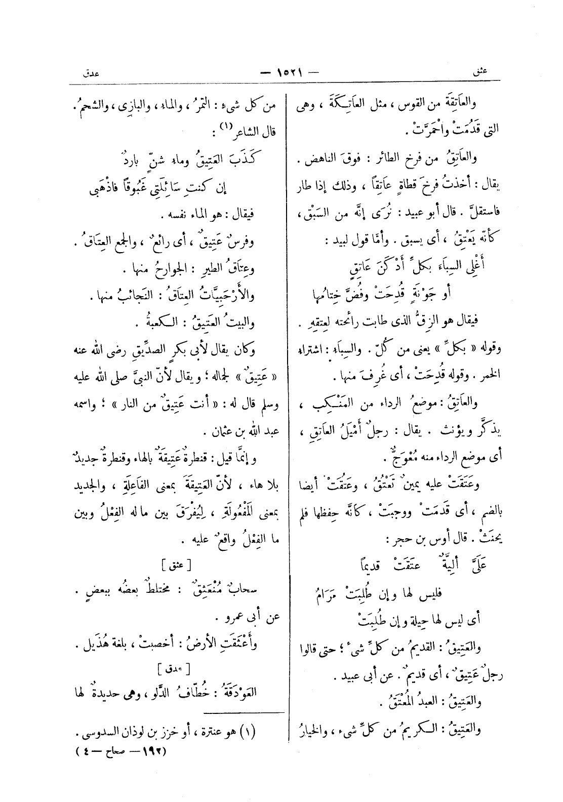 من كل شئ: التمر، والماءُ، والبازي، والشحمُ. قال الشاعر (¬1) : كَذَبَ العَتيقُ وماءُ شنٍّ باردٌ إن كنتِ سائِلتي غَبوقاً فاذْهبي فيقال: هو الماء نفسه. وفرسٌ عَتِيقٌ، أي رائِعٌ، والجمع العِتاقُ. وعِتاقُ الطَيْرُ: الجوارحُ منها. والأَرْحَبِيَّاتُ العِتاقُ: النَجائبُ منها. والبيتُ العَتيقُ: الكعبة. وكان يقال لابي بكر الصديق رضى الله عنه " عتيق " لجماله، ويقال لان النبي صلى الله عليه وسلم قال له: " أنت عتيق من النار "، واسمه عبد الله بن عثمان. وإنما قيل: قنطرة: عتيقة بالهاء وقنطرة جديد بلا هاء، لان العتيقة بمعنى الفاعلة، والجديد بمعنى المفعولة، ليفرق بين ما له الفعل وبين ما الفعل وافق عليه.