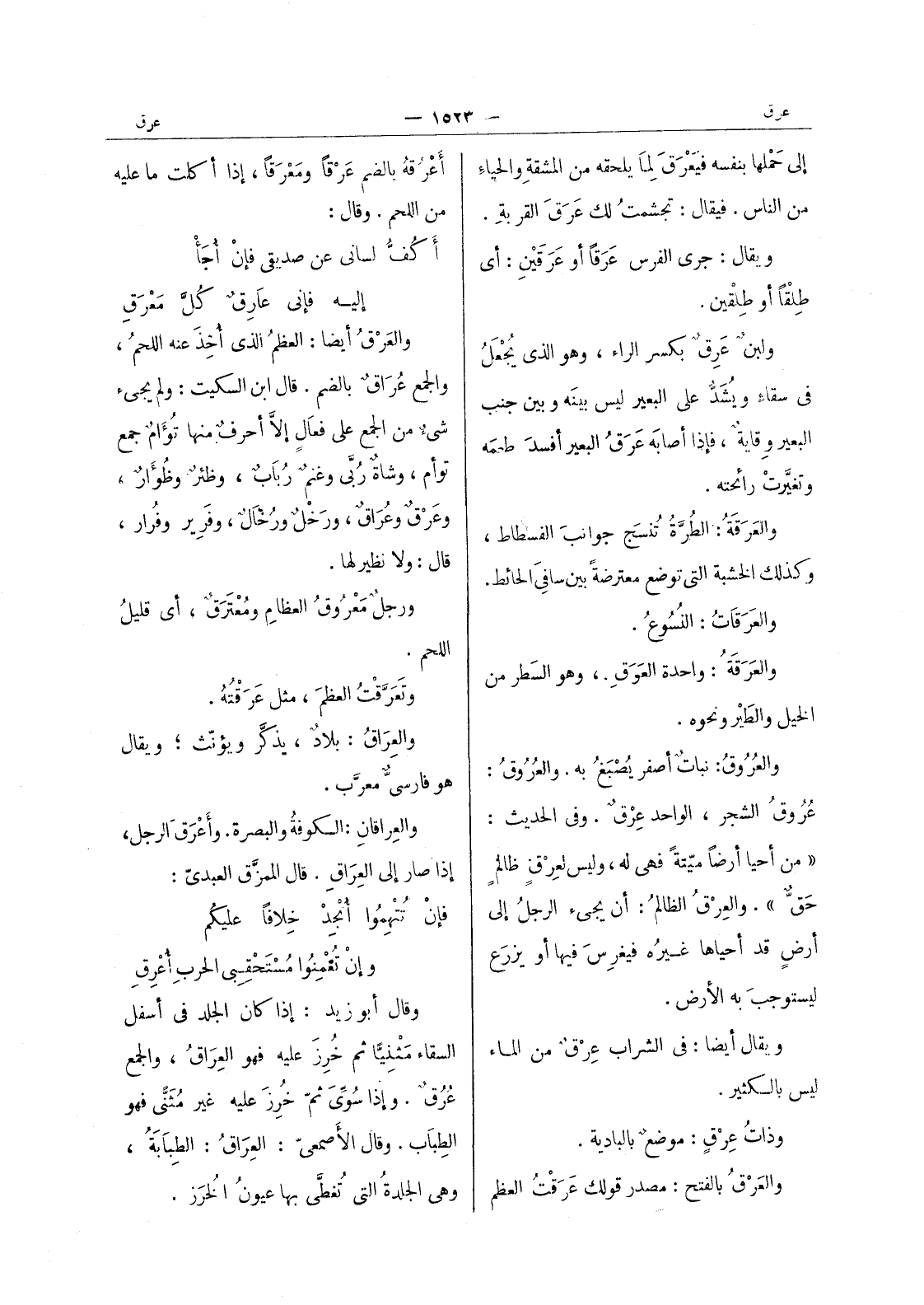 أعرقة بالضم عرقا ومعرقا، إذا أكلت ما عليه من اللحم. وقال: أكُفُّ لساني عن صديقي فإنْ أُجَأْ إليه فإني عارِقٌ كُلَّ مَعْرَقِ والعَرْقُ أيضاً: العظمُ الذي أُخذَ عنه اللحمُ، والجمع عراق بالضم. قال ابن السكيت: ولم يجئ شئ من الجمع على فعال إلا أحرف منها تؤام جمع توأم، وشاة ربى غنم رباب، وظئر وظؤار، وعرق وعراق، ورخل ورخال، وفرير وفرار، قال: ولا نظير لها. ورجل معرق العظامِ ومُعْتَرَقٌ، أي قليلُ اللحم. وتعرقت العظم، مثل عرقته. والعراق: بلاد، يذكر ويؤنث، ويقال هو فارسي معرب. والعراقان: الكوفة والبصرة. وأعرق الرجل، إذا صار إلى العراق. قال الممزق العبدى: فإن تتهموا أنجد خلافا عليكم وإن تعمنوا مستحقبى الحرب أعرق وقال أبو زيد: إذا كانَ الجلد في أسفل السقاء مَثْنيًّا ثم خُرِزَ عليه فهو العِراقُ، والجمع عرق. وإذا سوى ثم خزر عليه غير مُثَنًّى فهو الطِباب. وقال الأصمعي: العِراقُ: الطِبابَةُ، وهي الجلدةُ التي تغطَّى بها عيونُ الخرز.