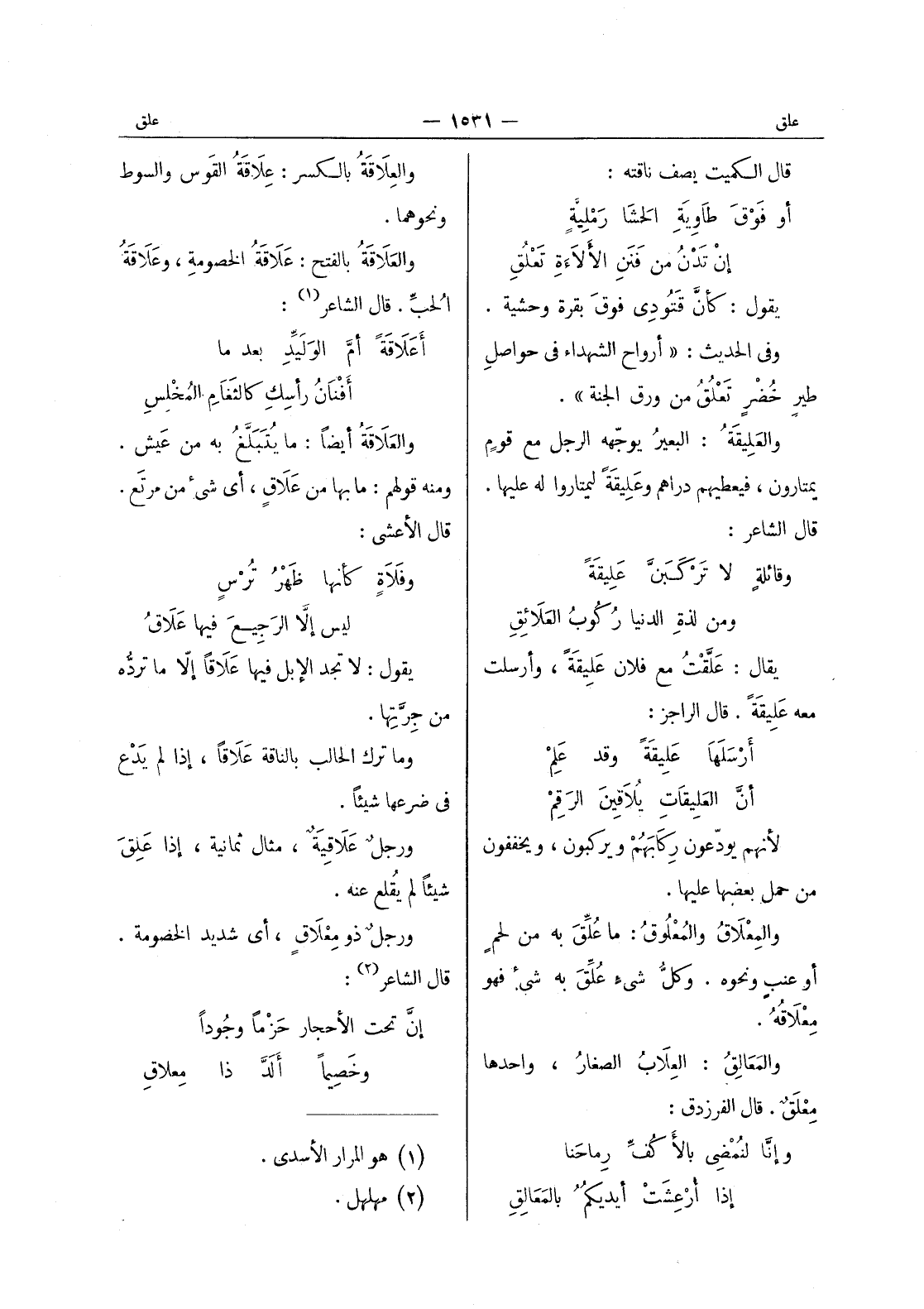 قال الكميت يصف ناقته: أو فوق طاوية الحشا رملية إن تدن من فنن الالاءة تعلق يقول: كأن قتودى فوق بقرة وحشية. وفى الحديث: " أرواح الشهداء في حواصلِ طيرٍ خُضْرٍ تَعْلُقُ من ورق الجنة ". والعَليقَةُ: البعيرُ يوجّهه الرجل مع قومٍ يمتارون، فيعطيهم دراهم وعَليقَةً ليمتاروا له عليها. قال الشاعر: وقائلةٍ لا تَرْكَبَنَّ عَليقَةً ومن لذةِ الدنيا رُكوبُ العَلائِقِ يقال: عَلَّقْت مع فلان عَليقَةً، وأرسلت معه عليقة. قال الراجز: أرسلها عليقة وقد علم أن العليقات يلاقين الرقم لانهم يودعون ركابهم ويركبون، ويخففون من حمل بعضها عليها. والمعلاق والمعلوق: ما عُلِّقَ به من لحمٍ أو عنب ونحوه. وكل شئ علق به شئ فهو معلاقه. والمَعالِقُ: العِلابُ الصغارُ، واحدها مِعْلَقٌ. قال الفرزدق: وإنا لنمضي بالا كف رماحنا إذا أرعشت أيديكم بالمعالق