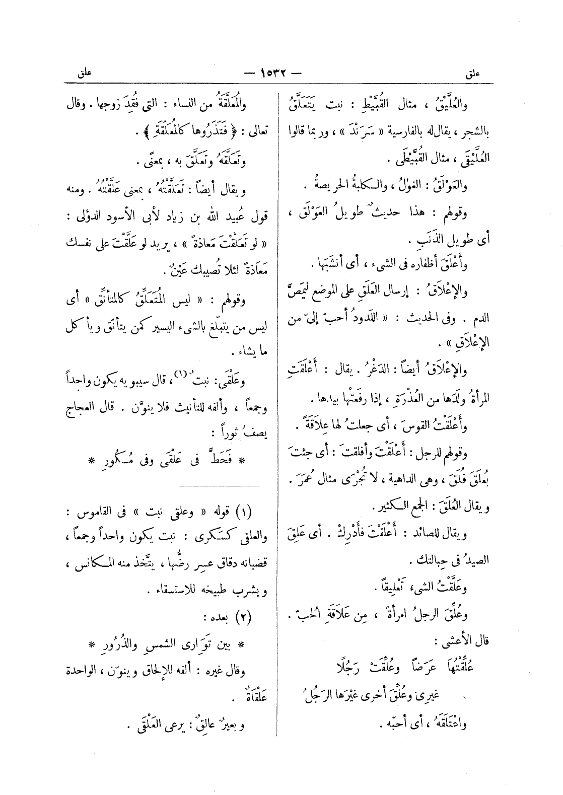 والعليق، مثال القبيط: نبت يتعلق بالشجر، يقال له بلفارسية " سرند "، وربما قالوا العليقى، مثال القبيطى. والعولق: الغول، والكلبة الحريصة. وقولهم: هذا حديثٌ طويلُ العَوْلَق، أي طويل الذَنَبِ. وأعْلَقَ أظفاره في الشئ، أي أنشبها. والإعْلاقُ: إرسال العَلَقِ على الموضع ليمَصَّ الدم. وفي الحديث: " اللَدودُ أحبّ إليّ من الإعْلاقِ ". والإعْلاقُ أيضاً: الدَغْرُ. يقال: أعْلَقَتِ المرأةُ ولها من العذرة، إذا رفعتها بيدها. وأعْلَقْتُ القوس، أي جعلتُ لها عِلاقَةً. وقولهم للرجل: أعْلَقْتَ وأفلقتَ: أي جئت بعُلَقَ فُلَقَ، وهي الداهية، لا تجرى مثال عُمَرَ. ويقال العُلَقَ: الجمع الكثير. ويقال للصائد: أعْلَقْتَ فأدْرِك. أي عَلِقَ الصيدُ في حبالتك. وعَلَّقْتُ الشئ تعليقا. وعلق الرجل امرأة، من علاقة الحب. قال الأعشى: عُلِّقْتُها عَرَضاً وعُلِّقَتْ رَجُلاً غيري وعُلِّقَ أخرى غيرَها الرَجُلُ واعْتَلَقَهُ، أي أحبه.
