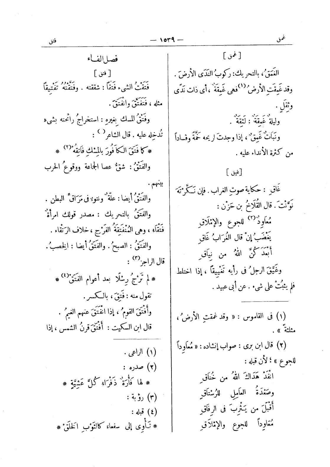 كما فَتَقَ الكافورَ بالمِسْكِ فاتِقُهْ (¬2) * والفَتْقُ: شقُّ عصا الجماعة ووقوع الحرب بينهم. والفَتْقُ أيضاً: علّةٌ ونتوءٌ في مراقِّ البطن. والفَتَقُ بالتحريك: مصدر قولك امرأةٌ فَتْقاءُ، وهي المُنْفَتِقَةُ الفَرْجِ، خلاف الرَتْقاء. والفَتَقُ: الصبحُ. والفَتَقُ أيضاً: الخصب. قال الراجز (¬3) :