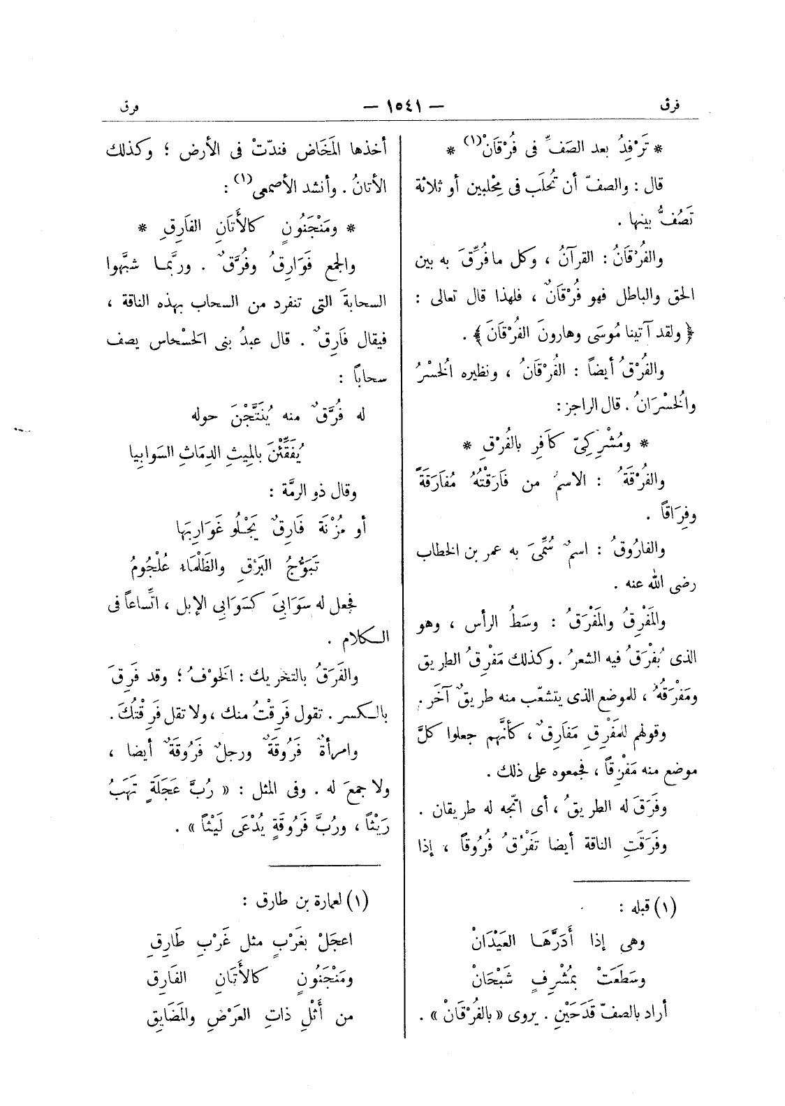 ومشركى كافر بالفرق * والفُرْقَةُ: الاسم من فارقْتُهُ مُفارقَةً وفراقا. والفاروق: اسم سمى به عمر بن الخطاب رضى الله عنه. والمفرق والمفرق: وسط الرأس، وهو الذى بفرق فيه الشعر. وكذلك مَفْرِقُ الطريق ومَفْرَقَهُ، للموضع الذي يتشعب منه طريقٌ آخر. وقولهم للمفرِقِ مفارِقٌ، كأنَّهم جعلوا كلَّ موضع منه مَفْرِقاً، فجمعوه على ذلك. وفَرَقَ له الطريق، أي اتَّجه له طريقان. وفَرَقَتِ الناقة أيضاً تَفْرُقُ فُروقاً، إذا