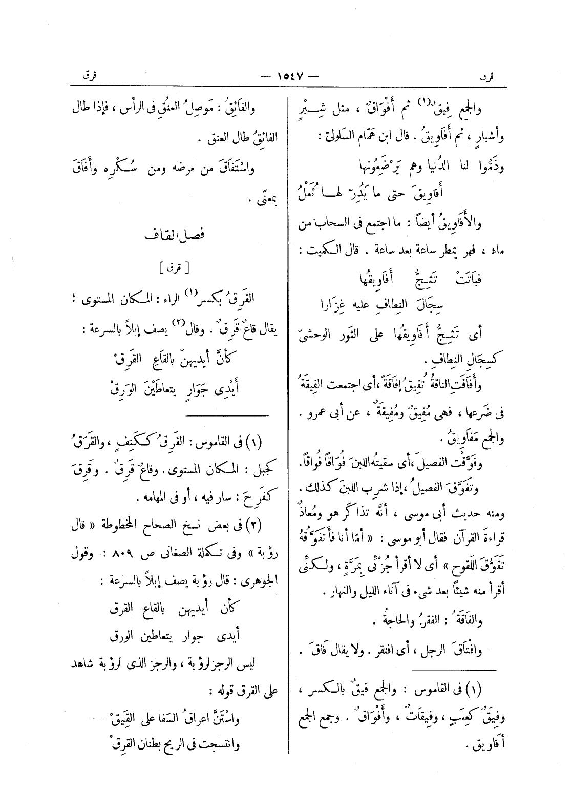 (¬2) في بعض نسخ الصحاح المخطوطة " قال رؤبة " وفى تكملة الصغانى ص 809: وقول الجوهرى: قال رؤبة يصف إبلا بالسرعة: كأن أيديهن بالقاع القرق أيدى جوار يتعاطين الورق ليس الرجز لرؤبة، والرجز الذى لرؤبة شاهد على القرق قوله واستن اعراق السفا على القيق وانتسجت في الريح بطنان القرق