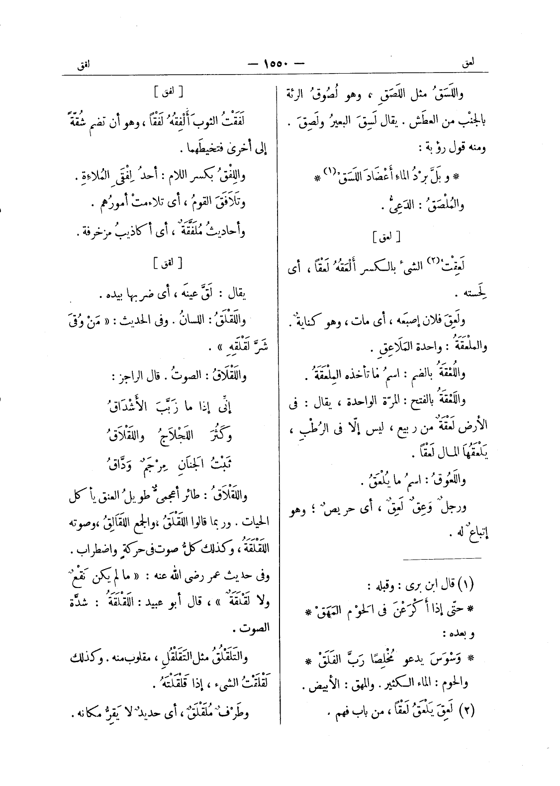 [لفق] يقال: لق عينه، أي ضربها بيده. واللقلق: اللسان. وفى الحديث: " من وُقيَ شَرَّ لَقّلَقِهِ ". واللَقْلاقُ: الصوت. قال الرجز: إنى إذا ما زَبَّبَ الأشْداقُ وكَثُرَ اللَجْلاجُ واللَقْلاقُ ثَبْتُ الجَنانِ مِرْجَمٌ وَدَّاقُ واللقلان: طلائر أعجمى طويل العنق يأكل الحيات. وربَّما قالوا اللَقْلَقُ، والجمع اللَقالِقُ، وصوته اللَقْلَقَةُ، وكذلك كلُّ صوت في حركةٍ واضطراب. وفي حديث عمر رضي الله عنه: " ما لم يكن نَقْعٌ ولا لَقْلَقَةٌ "، قال أبو عبيد: اللَقْلَقَةُ: شدَّة الصوت. والتَلَقْلُقُ مثل التَقَلْقُل، مقلوب منه. وكذلك لَقْلَقْتُ الشئ إذا قلقلته. وطرف ملقلق، أي حديدٌ لا يَقِرُّ مكانه.