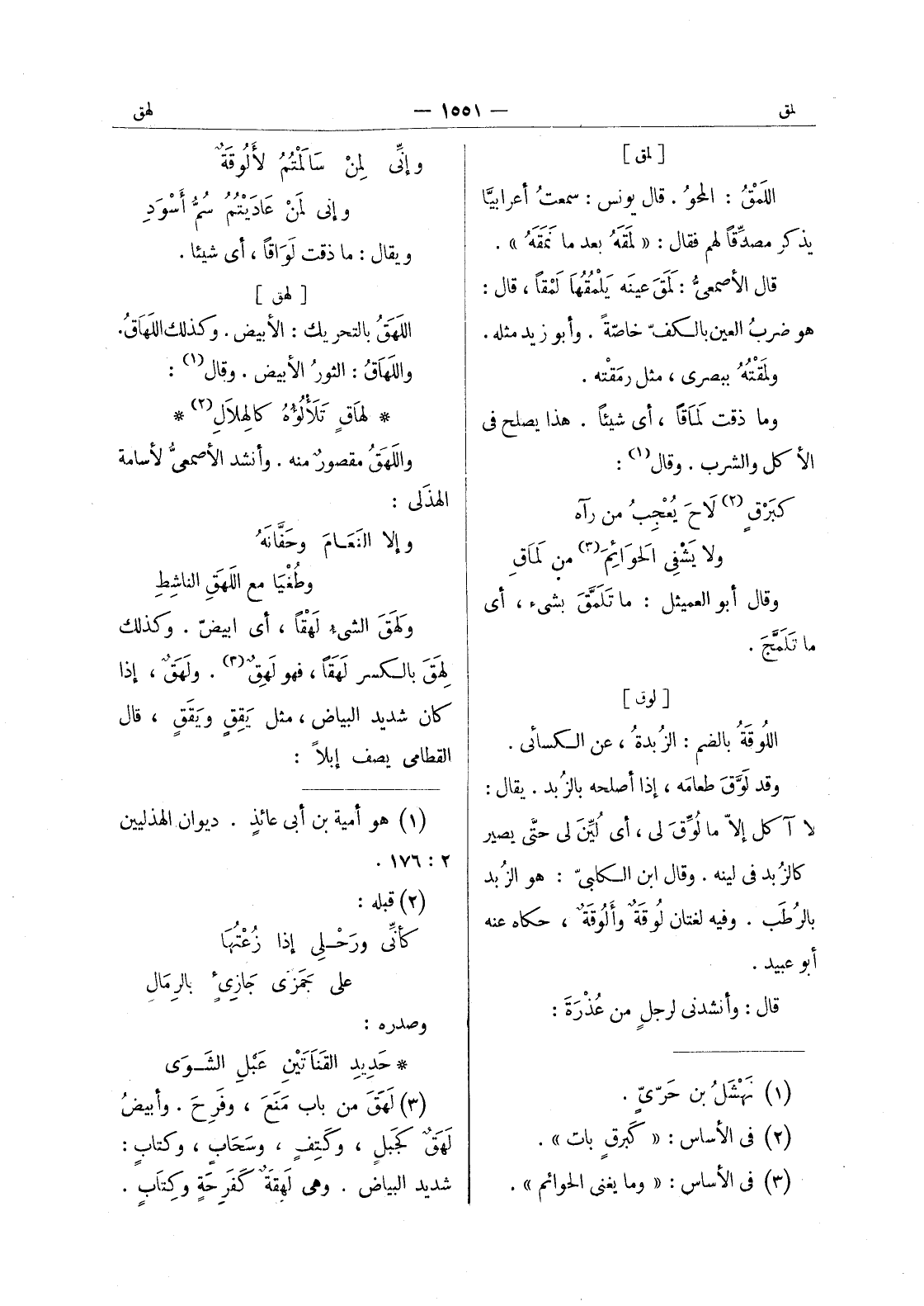 [لمق] اللمْقُ: المحوُ. قال يونس: سمعتُ أعرابيًّا يذكر مصدِّقاً لهم فقال: " لمَقَهُ بعد ما نَمَقَهُ ". قال الاصمعي: لمق عينه بلمقها لَمْقاً، قال: هو ضربُ العين بالكف خاصة. وأبو زيد مثله. ولمقته ببصرى، مثل رَمَقْته. وما ذقت لَماقاً، أي شيئاً. هذا يصلح في الأكل والشرب. قال (¬1) : كبرق (¬2) لاح يعجب من رآه ولا يَشْفي الحَوائِمَ (¬3) من لماق قال أبو العميثل: ما تلمق بشئ، أي ما تلمج.
