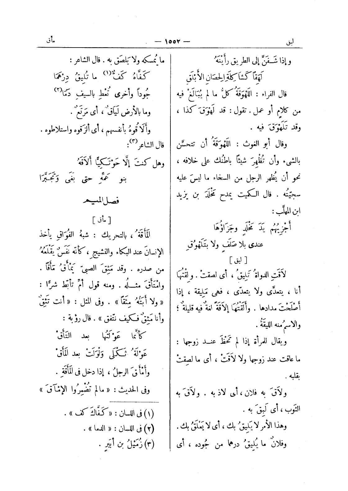 وإذا شَفَنَّ إلى الطريقِ رأَيْنَهُ لهقا كشا كلة الحصان الابلق قال الفراء: اللَهْوَقَةُ كلُّ ما لم يُبالغ فيه من كلامٍ أو عمل. تقول: قد لَهْوَقَ كذا، وقد تَلَهْوَقَ فيه. وقال أبو الغوث: اللهوقة أن تتحسن بالشئ وأن تظهر شيئا على خلافه، نحو أن يُظهر الرجل من السخاء ما ليسَ عليه سجيَّتُه. قال الكميت يمدح مَخْلَدَ بن يزيد ابن المهلَّب: أجْزيهُمُ يَدَ مَخْلَدٍ وجَزاؤُها عندي بلا صلف ولا بتلهوق