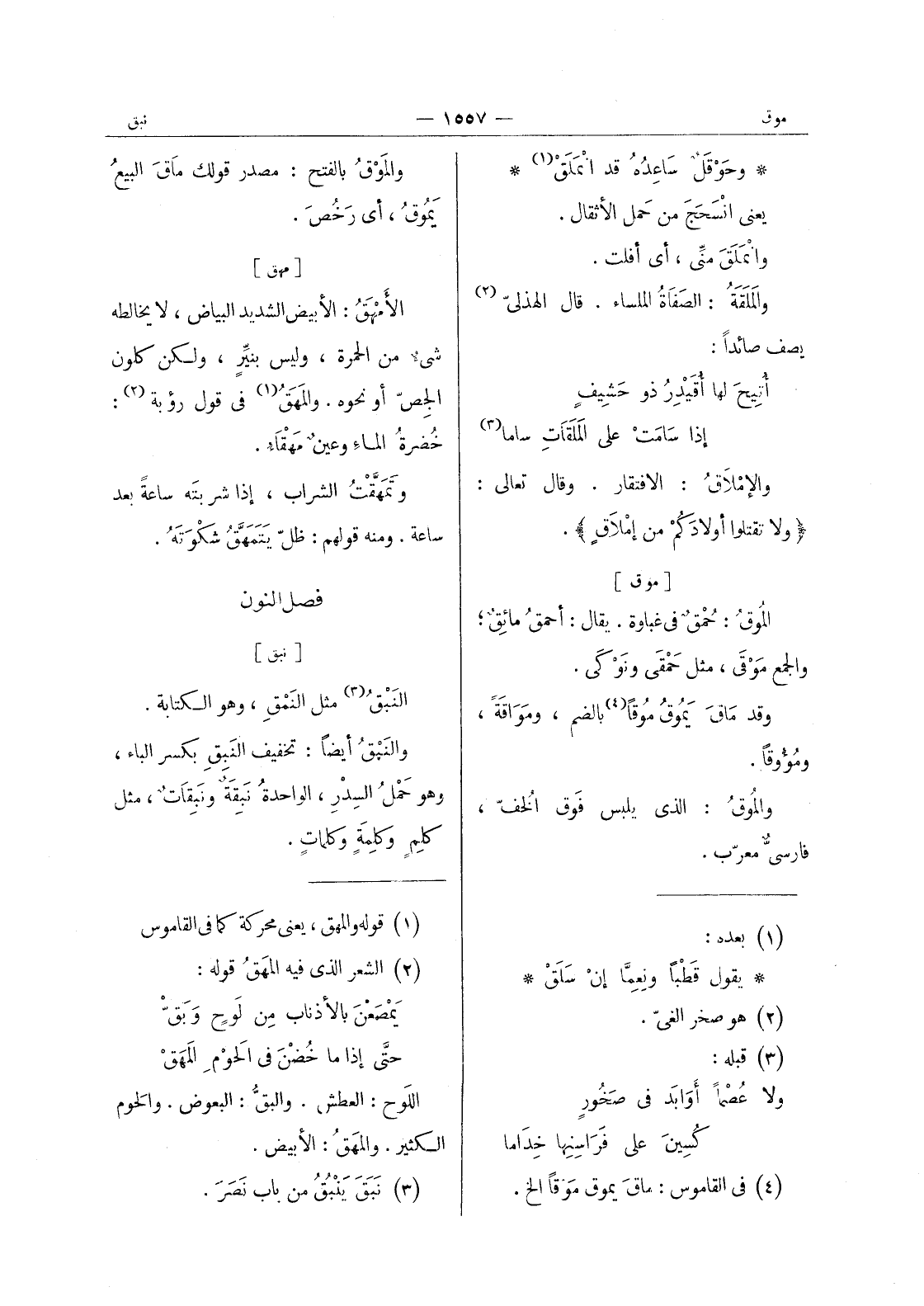 [موق] الموقُ: حُمْقٌ في غباوة. يقال: أحمقُ مائِقٌ، والجمع مَوْقى، مثل حمقى ونوكى. وقد ماقَ يَموقُ مُوقاً (¬4) بالضم، ومَواقَةً، ومُؤُوقاً. والموقُ: الذي يُلبس فوق الخف، فارس معرب