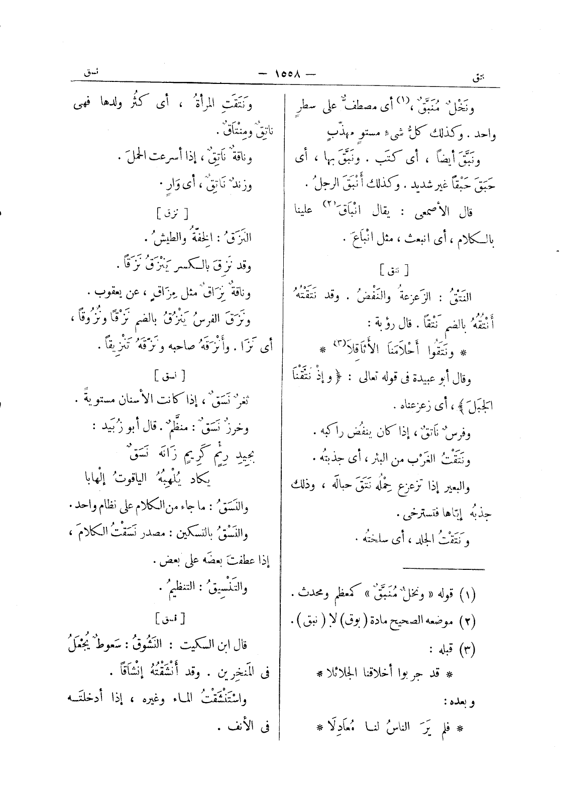 ونخل منبق، (¬1) أي مصطفٌّ على سطرٍ واحد. وكذلك كل شئ مستو مهذب ونَبَّقَ أيضا، أي كتَب. ونَبَّقَ بها، أي حَبَقَ حَبْقاً غير شديد. وكذلك أنبق الرجل. قال الاصمعي: يقال انْباقَ (¬2) علينا بالكلام، أي انبعث، مثل انباع.