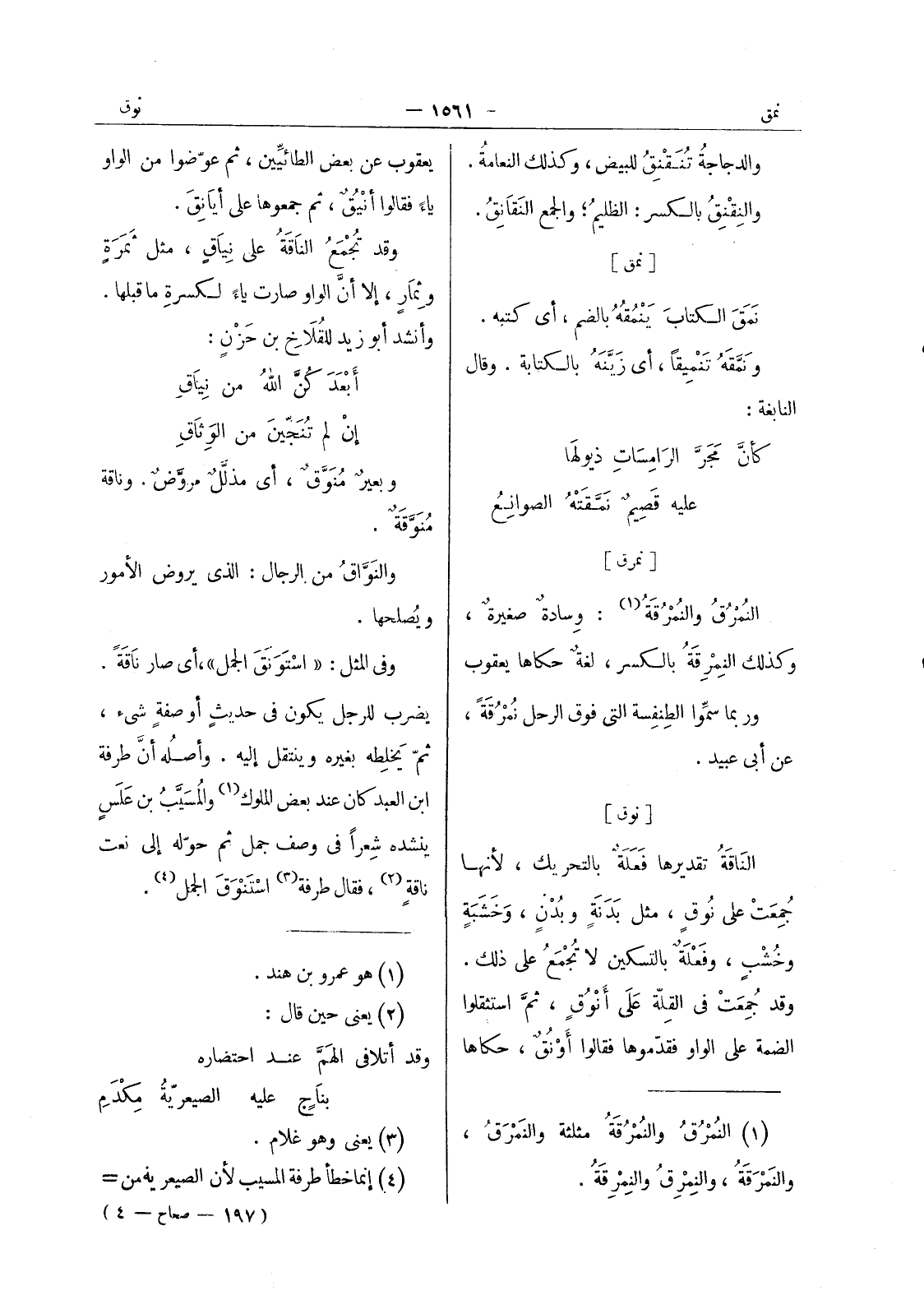 يعقوب عن بعض الطائيين، ثم عوضوا من الواو ياء فقالوا أنيق، ثم جمعوها على أيانق. وقد تجمع الناقة على نياق، مثل ثمرة وثمار، إلا أن الواو صارت ياء لكسرة ما قبلها. وأنشد أبو زيد للقلاخ بن حزن: أبعدكن الله من نياق إن لم تنجين من الوثاق وبعيرٌ مُنَوَّقٌ، أي مذلَّلٌ مروَّضٌ. وناقة مُنَوَّقةٌ. والنَوَّاقُ من الرجال: الذى يروض الامور ويصلحها. وفى المثل: " استونق الجمل "، أي صار ناقة. يضرب للرجل يكون في حديث أوصفة شئ، ثم يخلطه بغيره وينتقل إليه. وأصله أن طرفة ابن العبد كان عند بعض الملوك (¬1) والمسيب بن علس ينشده شعرا في وصف جمل ثم حوله إلى نعت ناقة (¬2) فقال طرفة (¬3) استنوق الجمل (¬4) .