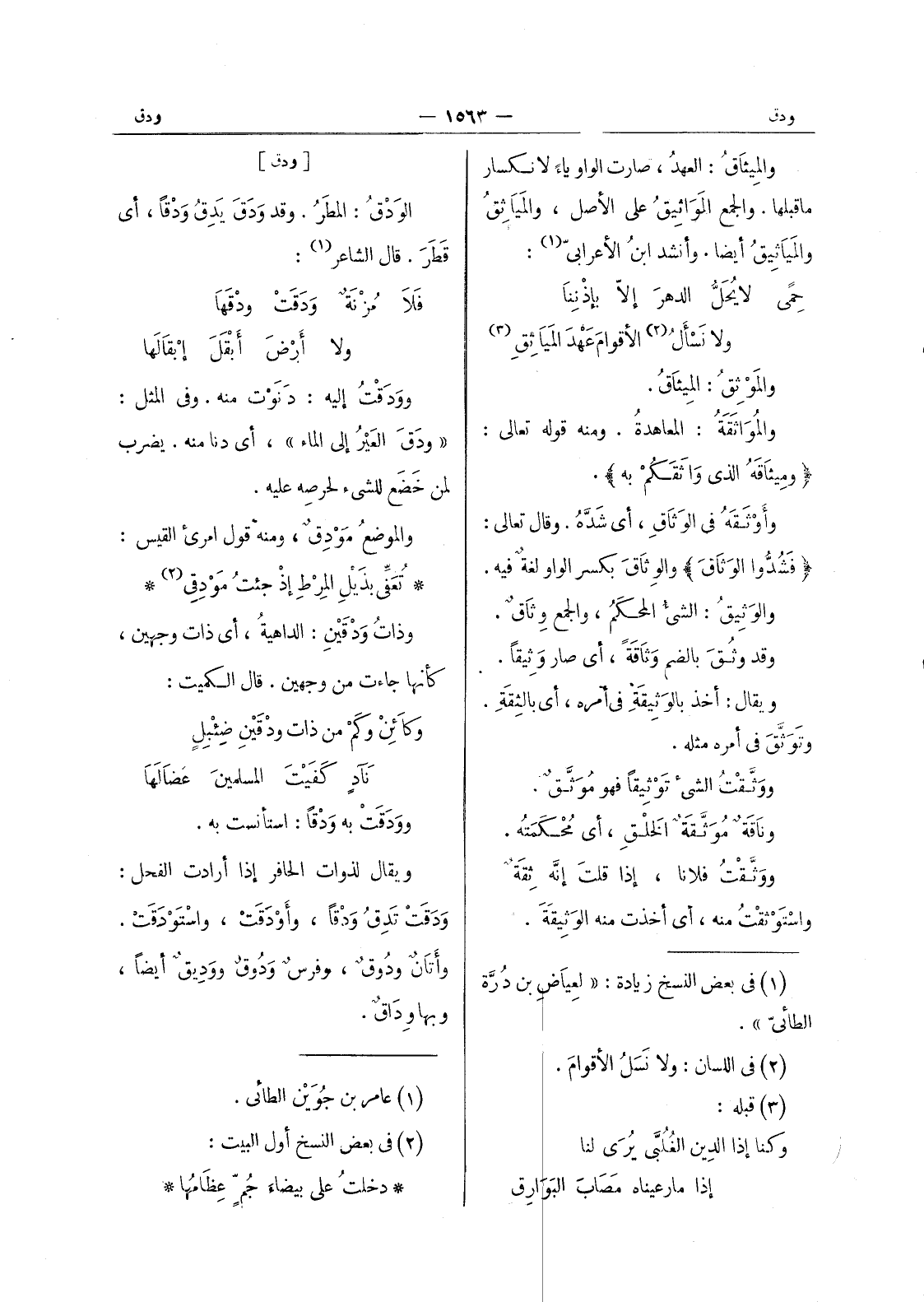تُعَفِّي بذَيْلِ المِرْطِ إذْ جئتُ مَوْدِقي (¬2) * وذاتُ وَدْقَيْنِ: الداهية، أي ذات وجهين، كأنَّها جاءت من وجهين. قال الكميت: وكائِنْ وكَمْ من ذات وَدْقَيْنِ ضِئْبِلٍ نَآدٍ كَفَيْتَ المسلمين عضالها وودقت ودقا: استأنست به. ويقال لذوات الحافر إذا أرادت الفحل: وَدَقَتْ تَدِقُ وَدْقاً، وأوْدَقَتْ، واسْتَوْدَقَتْ. وأتانٌ ودوقٌ، وفرسٌ وَدوقٌ ووَديقٌ أيضاً، وبها وداق.