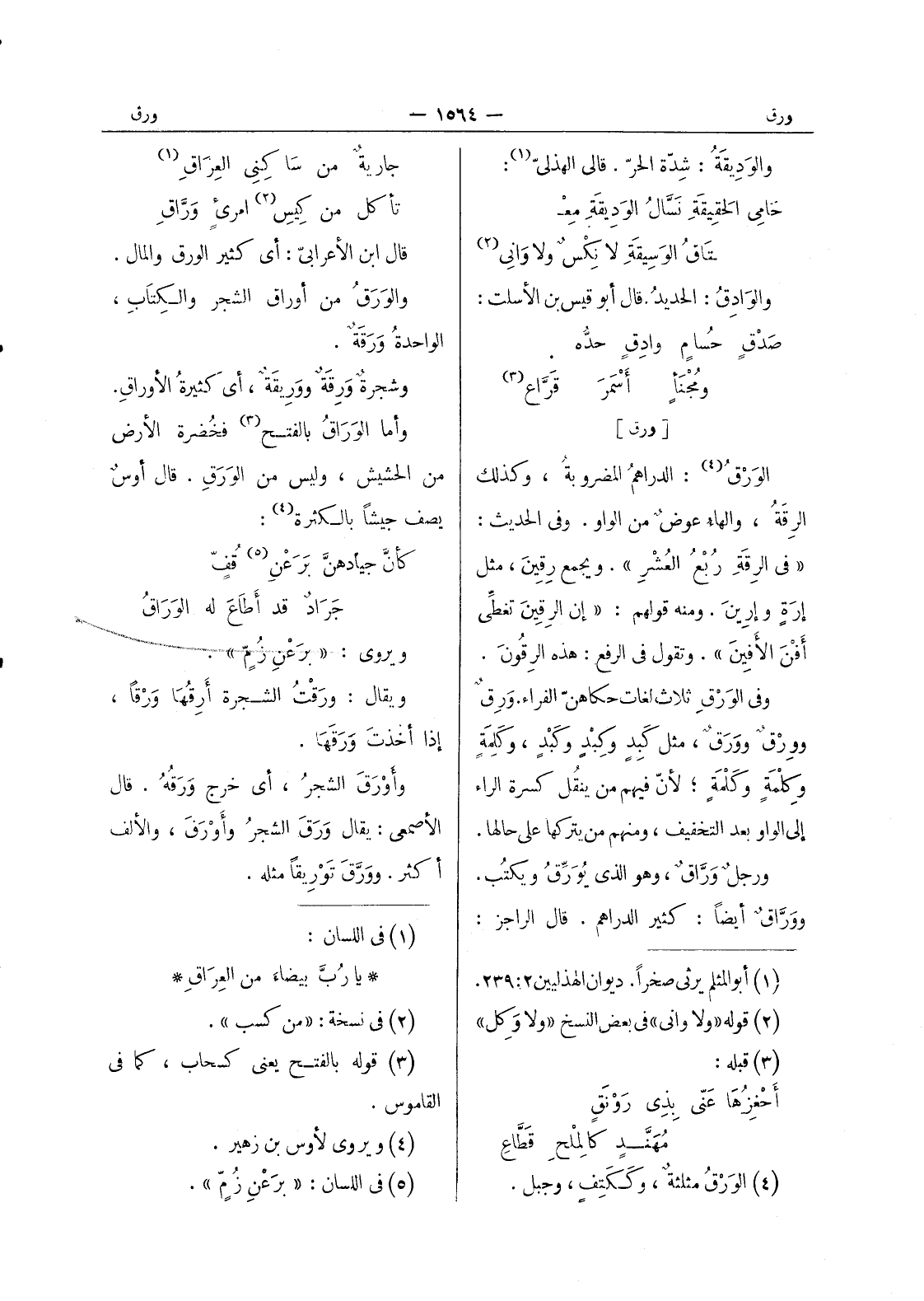 [ورق] الورق (¬4) : الدرهم المضروبة، وكذلك الرِقة، والهاء عوضٌ من الواو. وفي الحديث: " في الرِقَةِ رُبْعُ العُشْرِ ". ويجمع رِقينَ، مثل إرَةٍ وإرينَ. ومنه قولهم: " إن الرِقينَ تغطِّي أَفْنَ الأَفينَ ". وتقول في الرفع: هذه الرِقونَ. وفي الوَرْقِ ثلاث لغات حكاهنَّ الفراء. وَرِقٌ وورق وورق، مثل كبد وكبد وكبد، وكلمة وكلمة وكلمة، لان فيهم من ينقل كسرة الراء إلى الواو بعد التخفيف، منهم من يتركها على حالها. ورجل وراق، وهو الذي يُوَرِّقُ ويكتب. ووَرَّاقٌ أيضاً: كثير الدراهم. قال الراجز