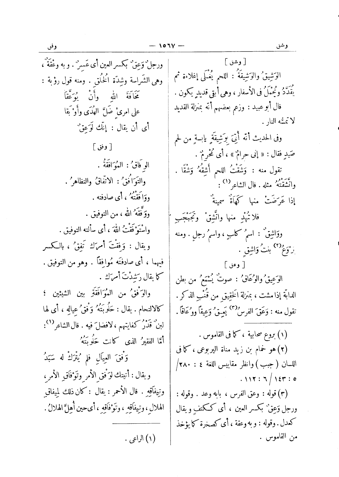 [وشق] الوَشيقُ والوَشيقَةُ: اللحم يُغلى إغلاءة ثم يقدد ويحمل في الاسفار، وهي أبقى قديدٍ يكون. قال أبو عبيد: وزعم بعضهم أنَّه بمنزلة القديد لا تمسُّه النار. وفي الحديث أنَّه أُتِيَ بوَشيقةٍ يابسةٍ من لحم صيدٍ فقال: " إنى محرم "، أي محرم. تقول منه: وَشَقْتُ اللحم أَشِقُهُ وَشْقاً. واتشقته مثله. قال الشاعر (¬1) : إذا عَرَضَتْ منها كَهاةٌ سمينةٌ فلا تُهْدِ منها واتشق وتجبجب وواشق: اسم كلب، واسم رجل. ومنه بروع (¬2) بنت واشق.
