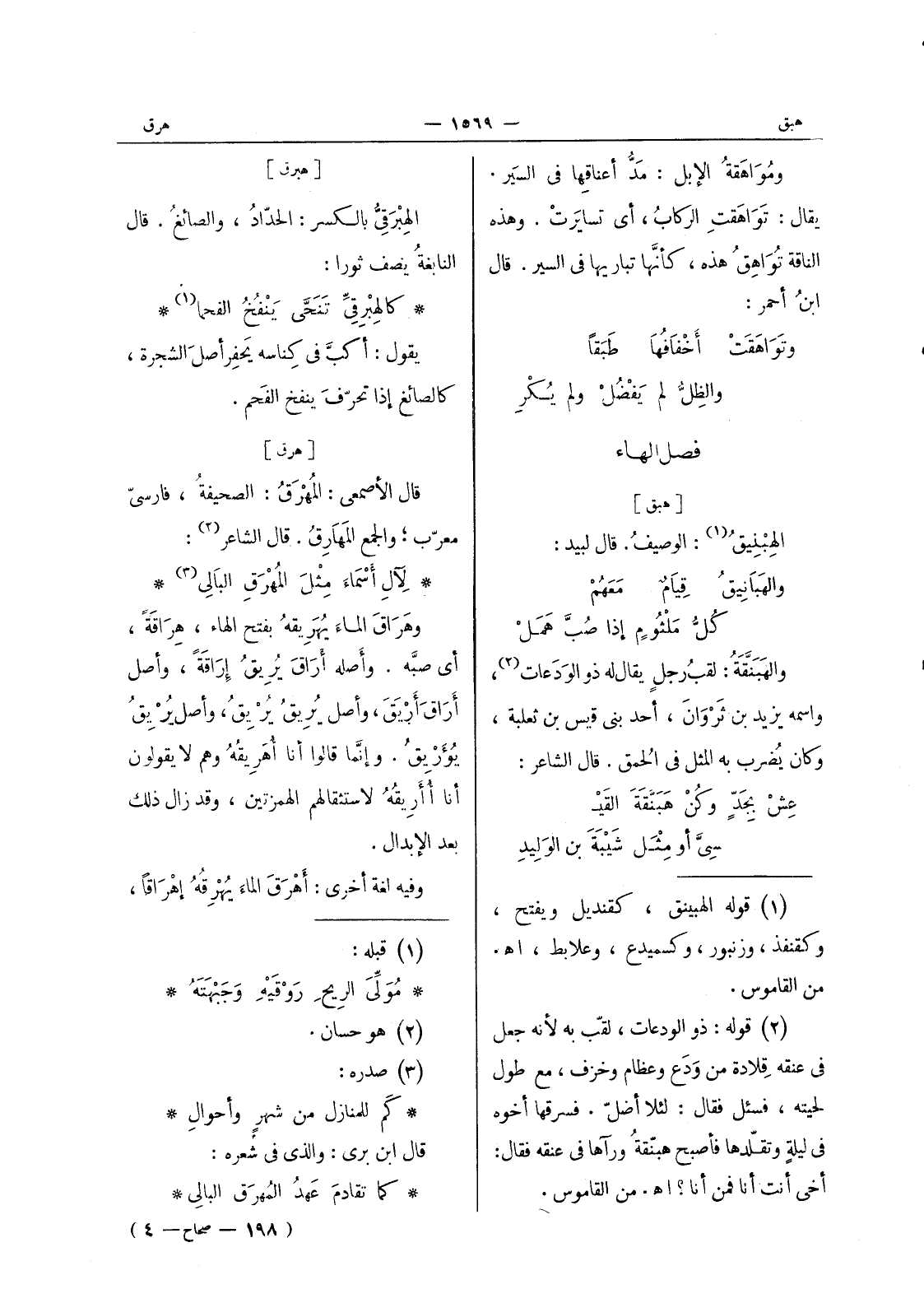 [هبق] الهبنيق (¬1) : الوصيف. قال لبيد: والهَبانيقُ قِيامٌ مَعَهُم، كُلُّ مَلْثومٍ إذا صب همل والهبنقة: لقب رجل يقال له ذو الودعات (¬2) ، واسمه يزيد بن ثروان، أحد بنى قيس بن ثعلبة، وكان يضرب به المثل في الحمق. قال الشاعر: عش بجد وكن هبنقة القيسي أو مثل شيبة بن الوليد
