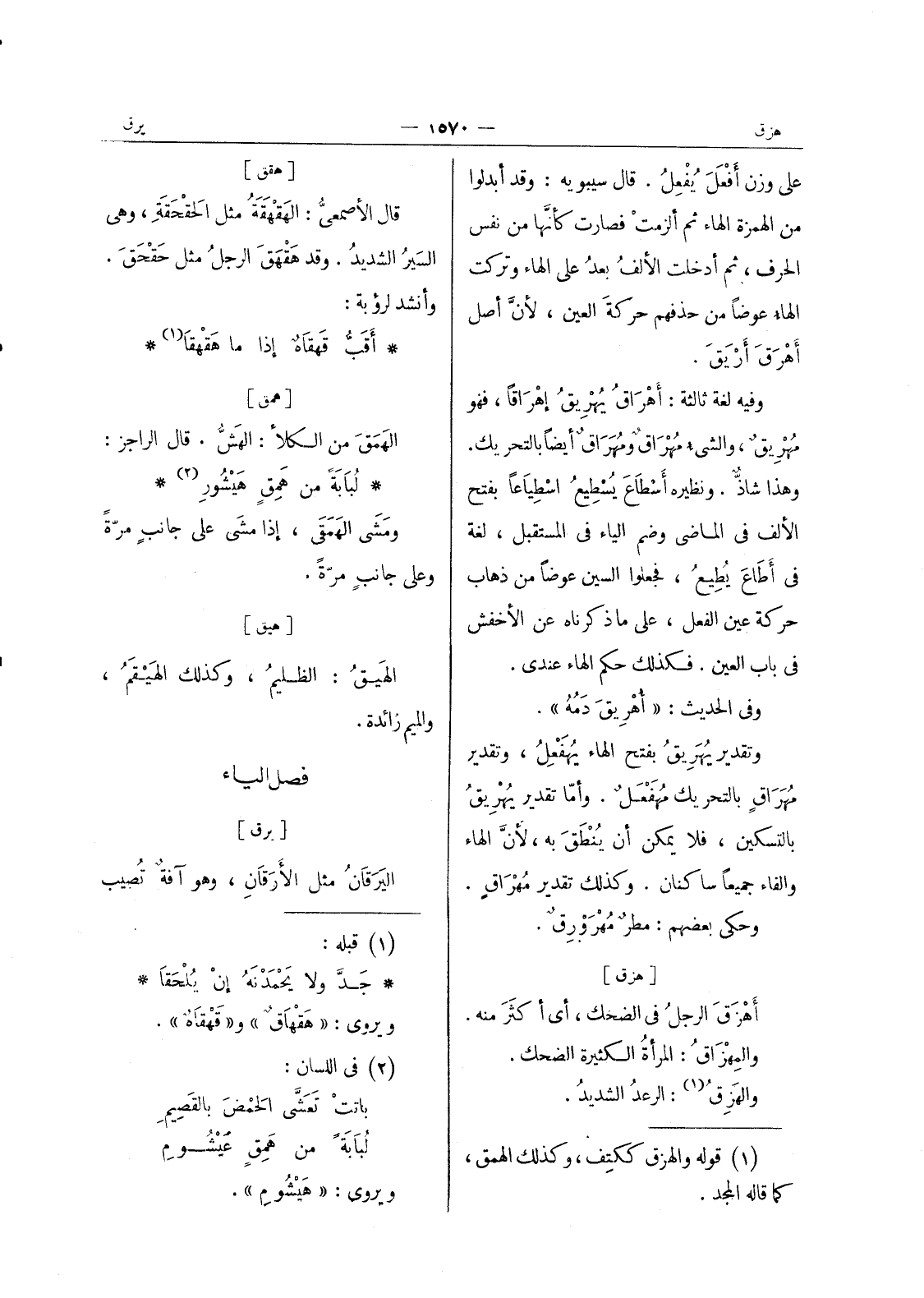 على وزن أفعل يفعل. قال سيبويه: وقد أبدلوا من الهمزة الهاء ثم ألزمت فصارت كأنها من نفس الحرف، ثم أدخلت الالف بعد على الهاء وتركت الهاء عوضا من حذفهم حركة العين، لان أصل أهرق أريق. وفيه لغة ثالثة: أَهْراقُ يُهْريقُ إهْراقاً، فهو مُهْريقٌ، والشئ مهراق ومهراق أيضا بالتحريك. وهذا شاذ. ونظيره أسطاع يسطيع اسطياعا بفتح الالف في الماضي وضم الياء في المستقبل، لغة في أطاع يطيع، فجعلوا السين عوضا من ذهاب حركة عين الفعل، على ما ذكرناه عن الاخفش في باب العين. فكذلك حكم الهاء عندي. وفى الحديث، " أهريق دمه ". وتقدير يهريق بفتح الهاء يهفعل، وتقدير مهراق بالتحريك مهفعل. أما تقدير يهريق بالتسكين، فلا يمكن أن ينطق به، لان الهاء والفاء جميعا ساكنان. وكذلك تقدير مهراق. وحكى بعضهم: مطر مهرورق.