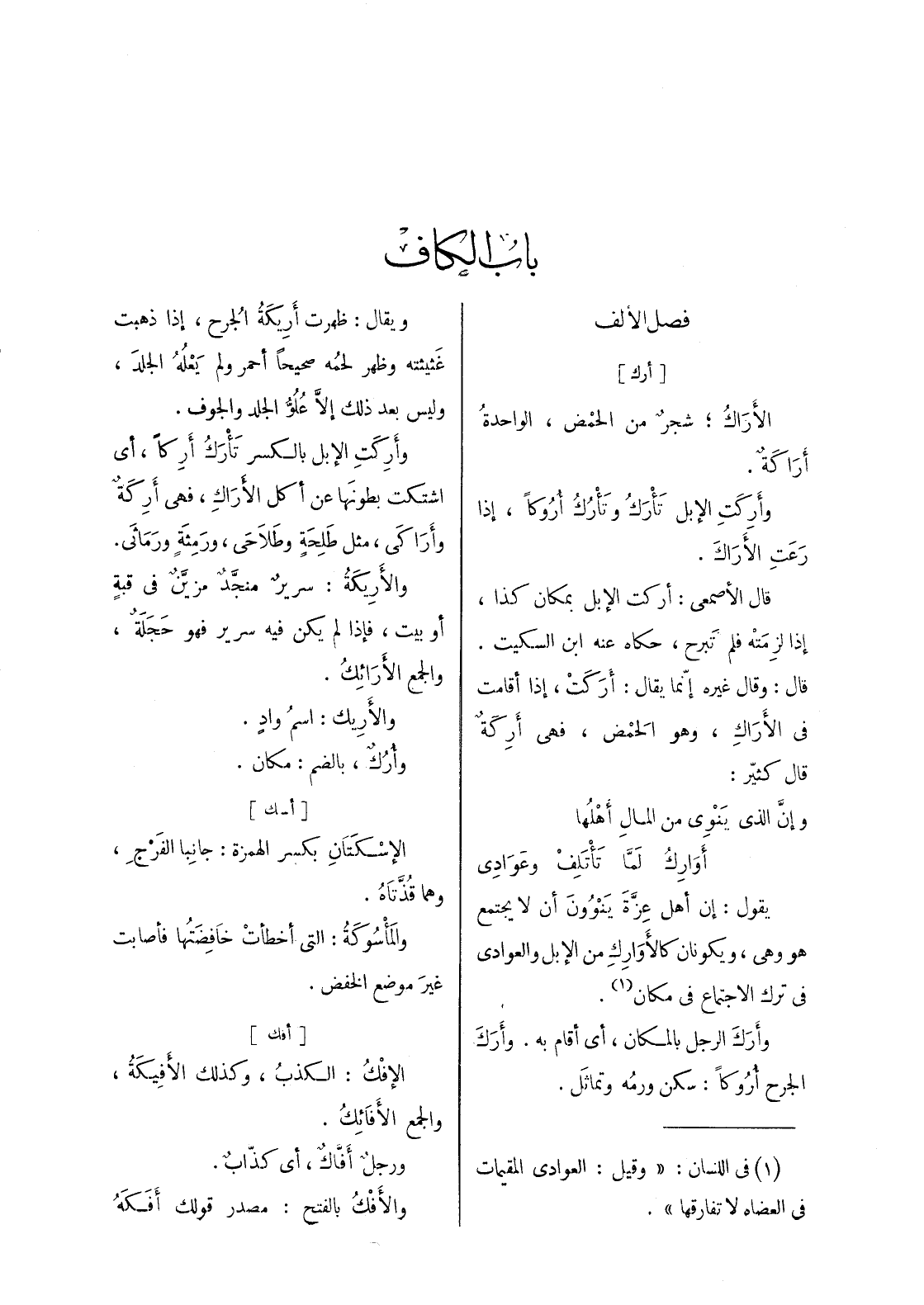 [أرك] الاراك، شجر من الحمض، الواحدة أراكة. وأركت الابل تأرك وتأرك أُروكاً، إذا رَعَتِ الأَراكَ. قال الأصمعي: أركت الإبل بمكان كذا، إذا لزِمَتْه فلم تَبرح، حكاه عنه ابن السكيت. قال: وقال غيره إنّما يقال: أَرَكَتْ، إذا أقامت في الأَراكِ، وهو الحَمض، فهى أركة قال كثير: وإن الذى ينوى من المال أهلها أوراك لما تأتلف وعوادى يقول: إن أهل عزة ينوون أن لا يجتمع هو وهى، ويكونان كالاوارك من الابل والعوادي في ترك الاجتماع في مكان (¬1) . وأرك الرجل بالمكان، أي أقام به. وأرَكَ الجرح أروكا: سكن ورمه وتمائل.
