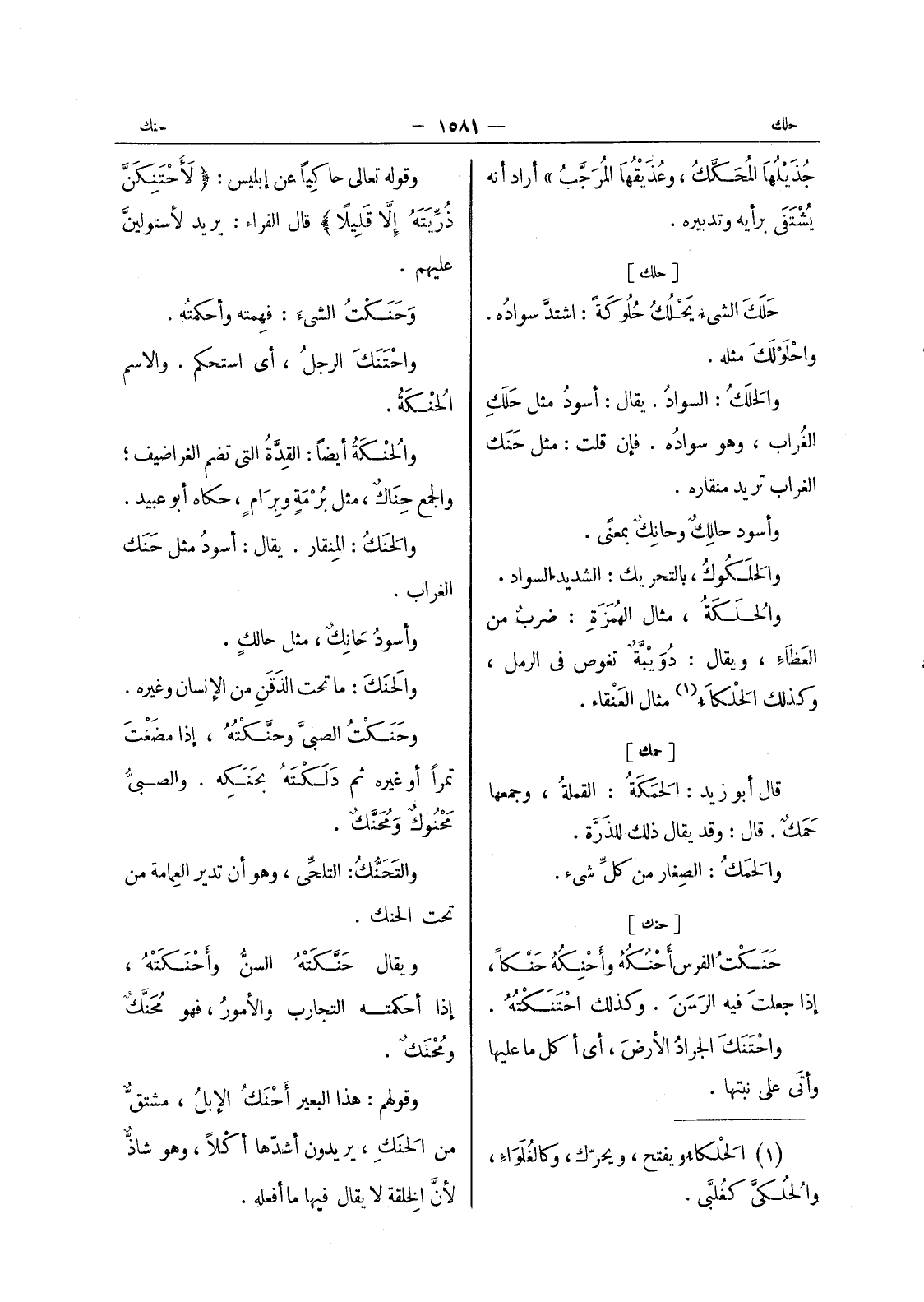 وقوله تعالى حاكيا عن إبليس: (لاحتكن ذريته إلا قليلاً) قال الفراء: يريد لأستولينَّ عليهم. وحنكت الشئ: فهمته وأحكمته. واحْتَنَكَ الرجلُ، أي استحكم. والاسم الحُنْكَةُ. والحُنْكَةُ أيضاً: القِدَّةُ التي تضم الغراضيف، والجمع حناك، مثل برمة وبرام حكاه أبو عبيد. والحنك: المِنقار. يقال: أسودُ مثل حَنَك. الغراب. وأسود خانك، مثل حالك. والحَنَكَ: ما تحت الذَقَنِ من الإنسان وغيره. وحَنَكْتُ الصبيَّ وحنَّكْتُهُ. إذا مضَغْتَ تمراً أو غيره ثم دَلَكْتَهُ بحَنَكِه. والصبيُّ مَحْنوكٌ ومُحَنَّكٌ. والتَحَنُّكُ: التلحِّي. وهو أن تدير العمامة من تحن الحنك. ويقال حنكة السن وأحنكته. إذا أحكمته التجارب والأمورُ. فهو مُحَنَّكٌ ومحنك. وقولهم: هذا البعير أحنك الابل. مشتق من الحنك، يريدون أشدها أكلا، وهو شاذ لان الخلقه لا يقال فيها ما أفعله.