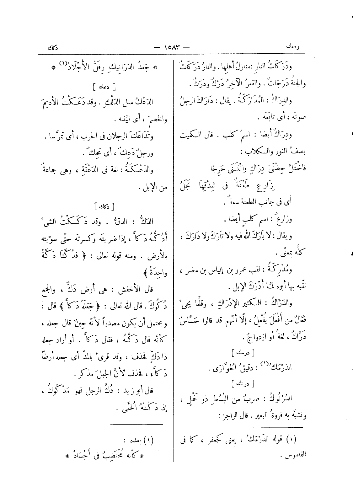 ودركات النارِ: منازلُ أهلِها، والنارُ دَرَكاتٌ والجنةُ دَرَجاتٌ. والقعرُ الآخِرُ دَرْكٌ ودَرَكٌ. والدِراكُ: المُدارَكَةُ. يقال: داراكَ الرجل صوته، أي تابعه. ودراك أيضا: اسم كلب. قال الكميت يصف الثور والكلاب: فاختل حضنى دراك واثننى حرجا لزارع طعنة في شدقها نجل أي في جانب الطعنة سعة. وزارع: اسم كلب أيضا. ويقال: لا بارَكَ الله فيه ولا تارَكَ ولا دارَكَ، كلُّه بمعنىً. ومدركة: لقب عمرو بن إلياس بن مضر، لقبه بها أبوه لما أدرك الابل. والدراك: الكثير الادراك. وقلما يجئ فعال من أفعل يفعل، إلا أنهم قد قالوا حساس دراك، لغة أو ازدواج.