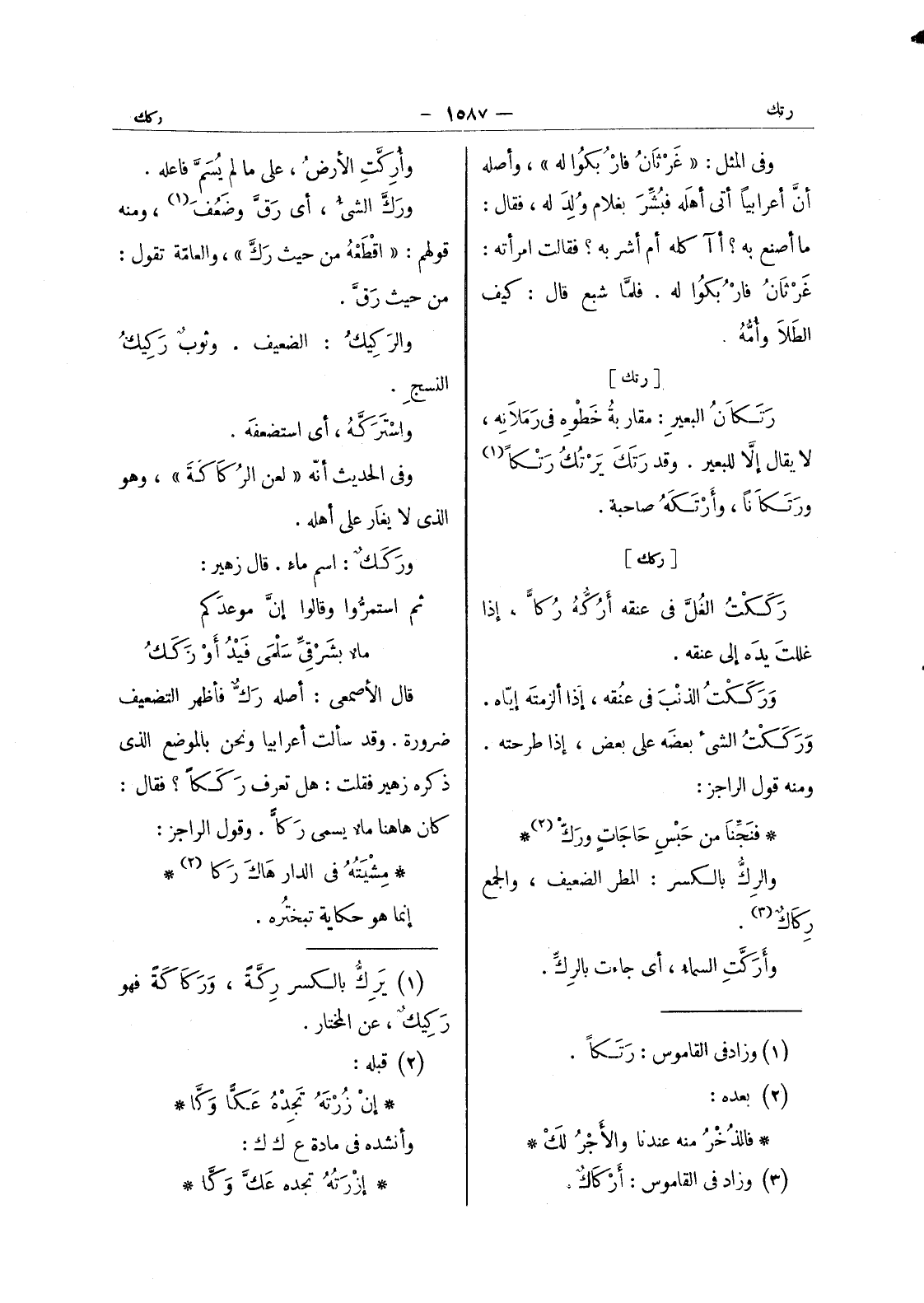 وأركت الارض، على ما لم يسمَّ فاعلُه. ورك الشئ، أي رَقَّ وضَعُفَ (¬1) ، ومنه قولهم: " اقطعه من حيث رك " والعامة تقول: من حيث رق. والركيك: الضعيف. وثوبٌ رَكيكُ النسجِ. واسْتَرَكَّهُ أي استضعَفَه. وفي الحديث أنه " لعن الرُكاكَةَ " وهو الذي لا يغار على أهله. وركك: اسم ماء قال زهير: ثم استمروا وقالوا إن موعدكم ماء بشرقي سلمى فيد أوزك قال الاصمعي: أصله رك فأظهر التضعيف ضرورة. وقد سألت أعرابيا ونحن بالموضع الذى ذكره زهير فقلت: هل تعرف رككا؟ فقال: كان ها هنا ماء يسمى ركا. وقول الراجز: