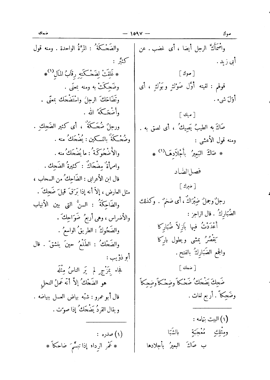 غاقت لضحكته رقاب المال (¬1) * وضحكت به ومنه بمعنًى. وتَضاحَكَ الرجلُ واسْتَضْحَكَ بمعنًى. وأضْحَكَهُ الله. ورجلٌ ضَحَكَةٌ، أي كثير الضَحِكِ. وضُحْكَةٌ بالتسكين: يُضْحَكُ منه. والأُضحوكَةُ: ما يُضْحَكُ منه. وامرأةٌ مِضحاك: كثيرةُ الضحِك. قال ابن الأعرابي: الضاحِكُ من السحاب، مثل العارض، إلا أنه إذا بَرَقَ قيلَ ضَحِكَ. والضاحِكَةُ: السنُّ التي بين الأنياب والأضراس، وهي أربعُ ضواحِكَ. والضَحوكُ: الطريقُ الواسعُ. والضَحْكُ: الطَلْعُ حينَ ينشقّ. قال أبو ذؤيب: فجاء بِمَزْجٍ لم يرَ الناسُ مِثلَه هو الضجك إلا أنه عمل النحلِ قال أبو عمرو: شبّه بياض العسل ببياضه. ويقال القردُ يضحك إذا صوت.