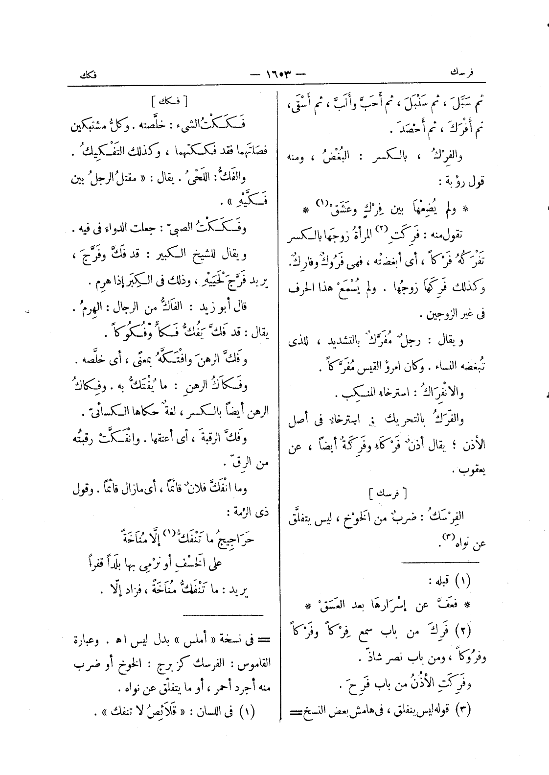 [فكك] فككت الشئ: خلصته. وكل مشتبكين فصَلتَهما فقد فككتهما، وكذلك التَفْكيكُ. والفَكُّ: اللَحْيُ. يقال: " مقتلُ الرجلُ بين فَكَّيْهِ " وفَكَكْتُ الصبيّ: جعلت الدواء في فيه. ويقال للشيخ الكبير: قد فَكَّ وفَرَّجَ، يريد فَرَّجَ لَحْيَيْهِ، وذلك في الكِبَر إذا هرِم. قال أبو زيد: الفاكُّ من الرجال: الهِرمُ. يقال: قد فَكَّ يَفُكُّ فَكًّا وفُكوكاً. وفَكُّ الرهنَ وافْتَكَّهُ بمعنًى، أي خلَّصه. وفَكاكُ الرهن: ما يُفْتَكُّ به. وفِكاكُ الرهن أيضاً بالكسر، لغةٌ حكاها الكسائيّ. وفَكَّ الرقبةَ، أي أعتقها. وانْفَكَّتْ رقبتُه من الرِقّ. وما انْفَكَّ فلانٌ قائماً، أي ما زال قائماً. وقول ذى الرمة: حراجيج ما تنفك (¬1) إلامناخة على الخسف أو نرمي بها بلدا قفرا يريد: ما تنفك مناخة، فزاد إلا.