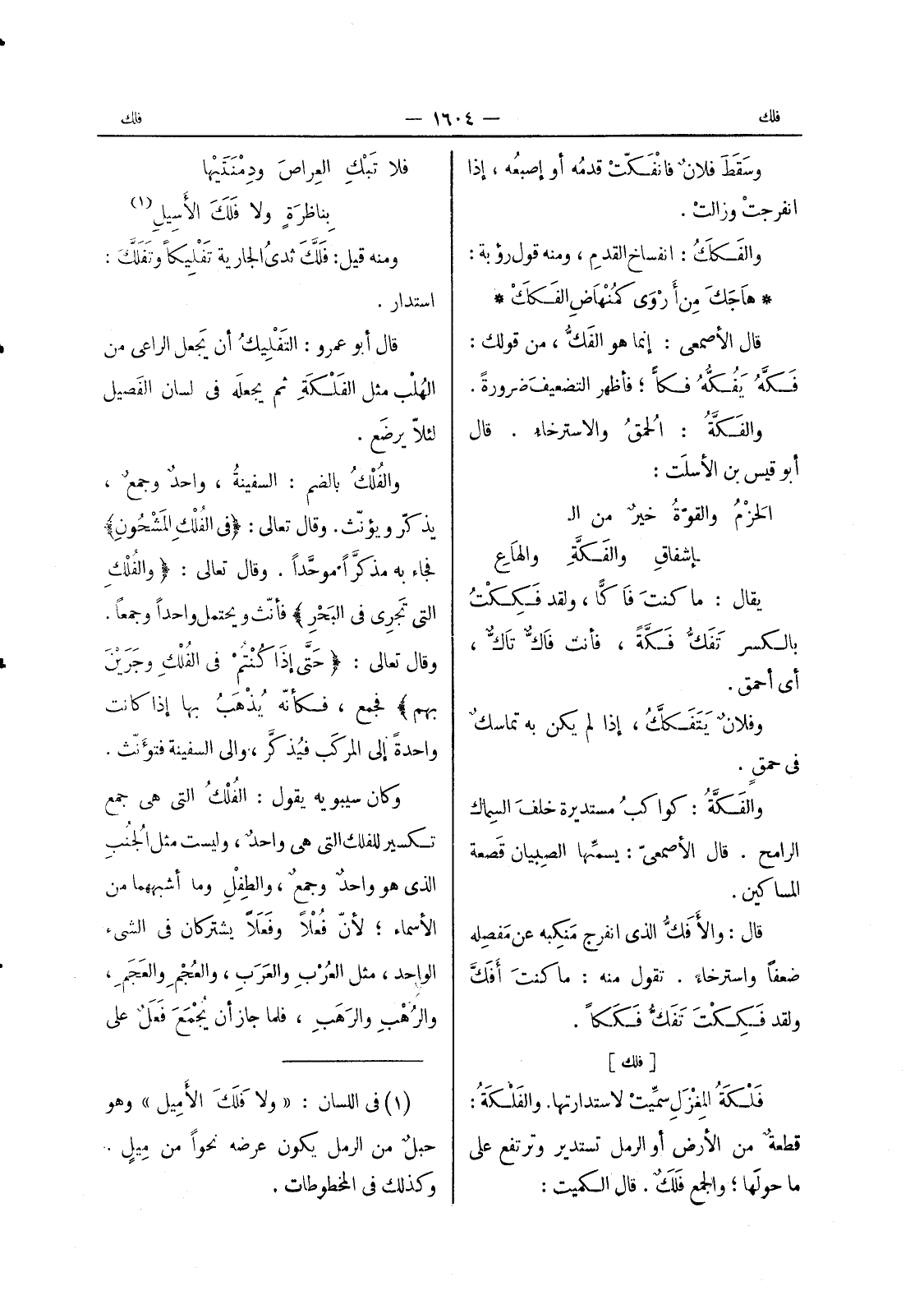 فلا تَبْكِ العِراصَ ودِمْنَتَيْها بِناظِرةٍ ولا فَلَكَ الأسيلِ (¬1) ومنه قيل: فلك ثدى الجارى تفليكا وتفلك: استدار. قال أبو عمرو: التَفْليكُ أن يجعل الراعي من الهُلب مثل الفَلْكَةِ ثم يجعله في لسان الفَصيل لئلاّ يرضع. والفُلْكُ بالضم: السفينة، واحدٌ وجمعٌ، يذكّر ويؤنّث. وقال تعالى: {في الفُلْكِ المَشْحونِ} فجاء به مذكَّراً. وقال تعالى: {والفلك التى يجرى البحر} فأنث ويحتمل واحداً وجمعاً. وقال تعالى: {حتَّى إذا كنتم في الفُلْكِ وجَرَيْنَ بهم} فجمع، فكأنه يذهب بها إذا كانت واحدة إلى المركب فيذكر، والى السفينة فتؤنث. وكان سيبويه يقول: الفلك التى هي جمع تكسير للفلك التى هي واحد، وليس مثل الجنب الذى هو واحد وجمع، والطفل وما أشبههما من الاس ماء، لان فعلا يشركان في الشئ الواحد، مثل العرب والعرب، والعجم والعجم، والرهب والرهب، فلما جاز أن يجمع فعل على
