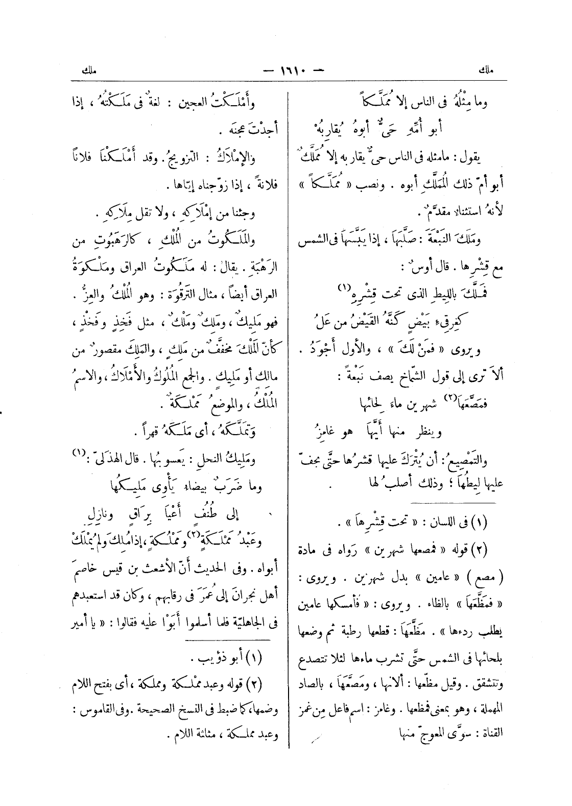 وأملكت العجين: لغة في مَلَكْتُهُ، إذا أجدتَ عجنَه. والإمْلاكُ: التزويجُ. وقد أمْلَكْنا فلاناً فلانَةً، إذا زوَّجناه إيَّاها. وجئنا من إمْلاكِهِ، ولا تقل مِلاكِهِ. والمَلَكوتُ من المُلْكِ، كالرَهَبوتِ من الرَهْبَةِ. يقال: له مَلَكوتُ العراق وملكوة العراق أيضا، مثال الترقوة: وهو الملك والعِزُّ. فهو مَليكٌ، ومَلِكٌ ومَلْكٌ، مثل فخذ وفخذ، كأنَّ المَلْكَ مخفَّفٌ من مَلكٍ، والملك مقصور من مالك أومليك. والجمع الملوك والاملاك، والاسم المُلْكُ، والموضع مَمْلَكَةٌ. وتمَلَّكَهُ، أي مَلَكَهُ قهراً. ومَليكُ النحلِ: يعسوبها. قال الهذلي: (¬1) وما ضَرَبٌ بيضاءُ يأوى ملكها إلى طنف أعيا بِراقٍ ونازِلِ وعبدُ مَمْلَكَةٍ (¬2) ومَمْلُكَةٍ، إذا مُلِكَ ولم يُمْلَكْ أبواه. في الحديث أن الاشعث بن قيس خاصم أهل نجران إلى عمر في رقابهم، وكان قد استعبد هم في الجاهلية فلما أسلموا أبوا عليه فقالوا: " يا أمير