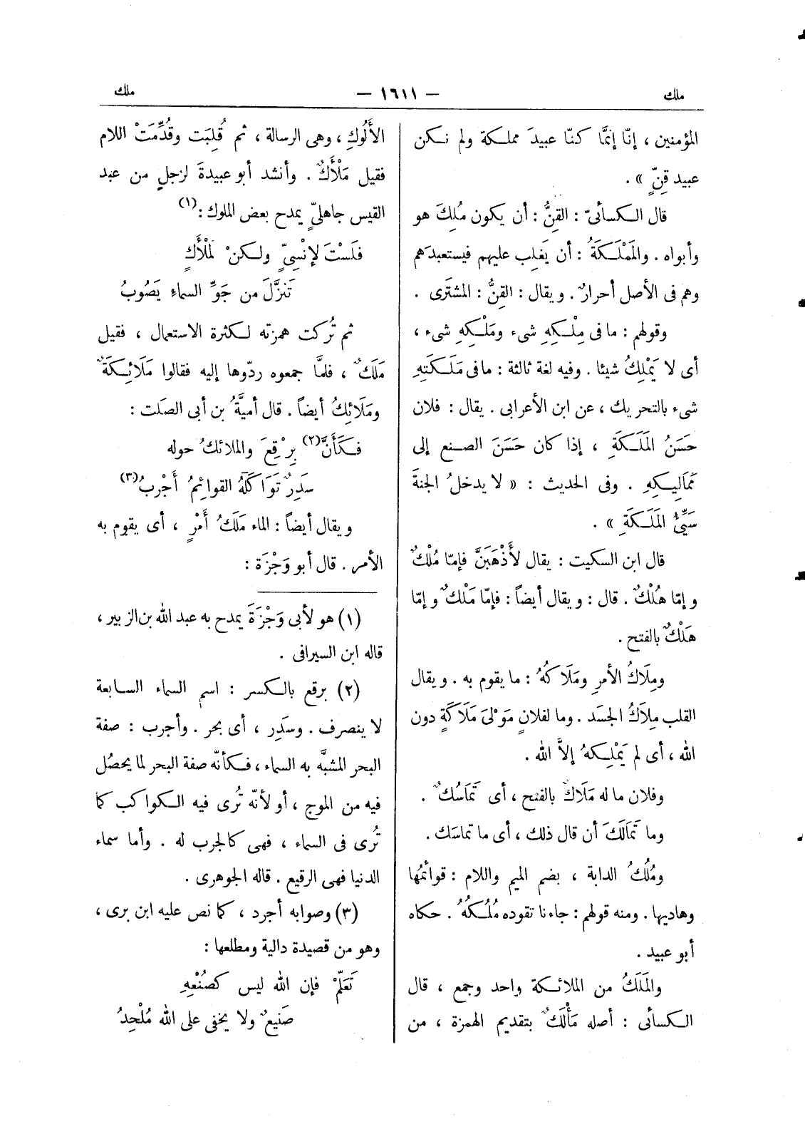 الالوك وهي الرسالة، ثمَّ قُلِبتْ وقدِّمتْ اللام فقيل ملأَكٌ. وأنشد أبو عبيدة لزجل من عبد القيس جاهلي يمدح بعض الملوك (¬1) فليست لإنْسِيٍّ ولكن لملأَكٍ تنزَّلَ من جَوِّ السماءِ يَصوبُ ثم تركت همزته لكثرة الاستعمال، فقيل مَلَكٌ، فلمَّا جمعوه ردُّوها إليه فقالوا ملائكة وملائك أيضا. قال أمية بن أبي الصلت: فكأنّ (¬2) بِرْقِعَ والمَلائِكَ حوله سدرتوا كله القوائم أجرب (¬3) ويقال أيضا: الماءُ مَلَكُ أمرٍ، أي يقوم به الامر. قال أبو وجزة