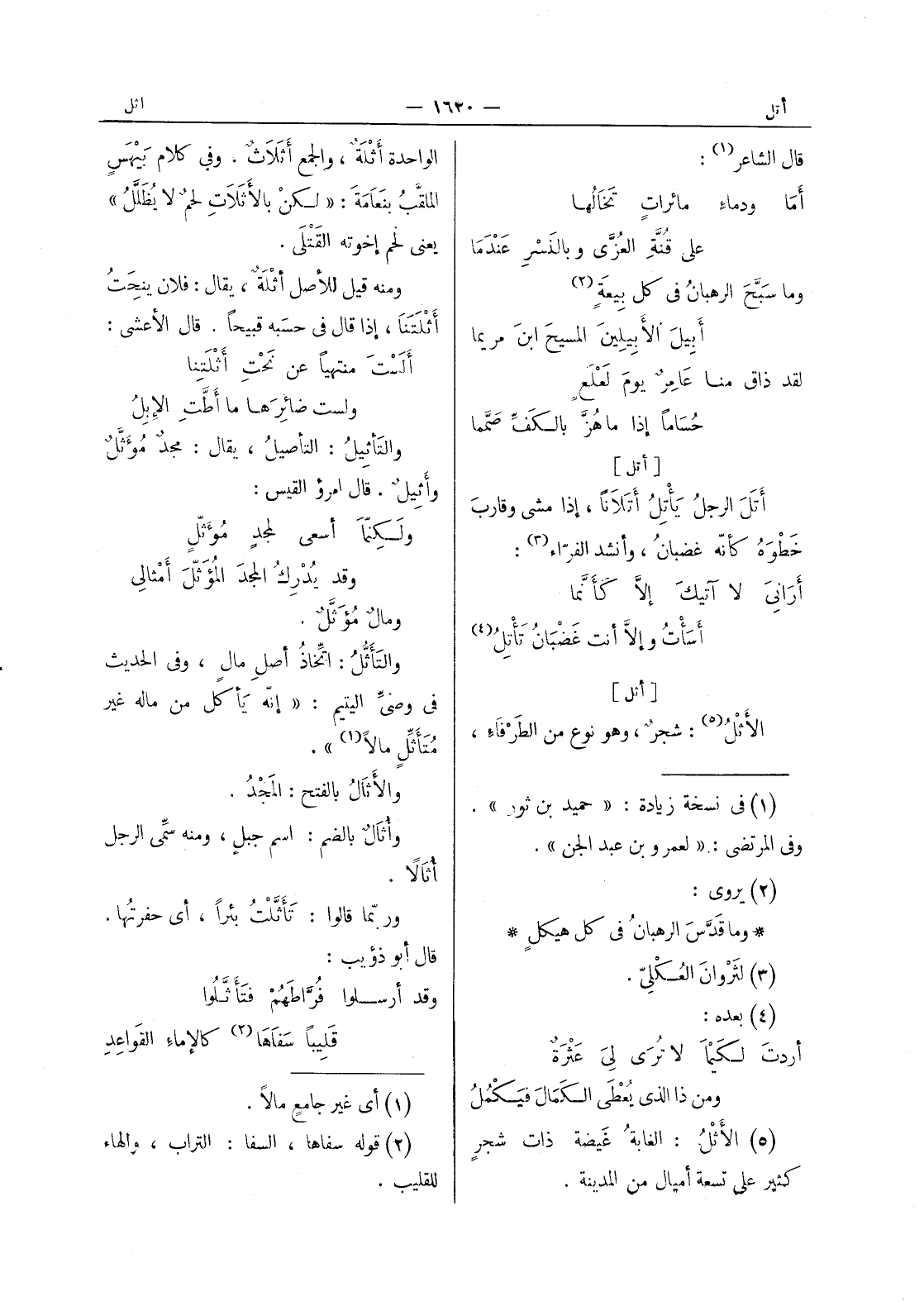 الواحدة أثلة، والجمع أثلاث. وفى كلام بيهس الملقب بنعامة: " لكن بالاثلات لحم لا يظلل " يعنى لحم إخوته القتلى. ومنه قيل للاصل أثلة، يقال: فللان ينحت أثلتنا، إذا قال في حسَبه قبيحاً. قال الأعشى: ألَسْتَ منتهياً عن نَحْتِ أَثْلَتِنا ولست ضائِرَها ما أَطَّتِ الإِبلُ والتَأثيلُ: التأصيلُ، يقال: مجدٌ مُؤَثَّلٌ وأَثيلٌ. قال امرؤ القيس: ولَكِنمّا أسعى لمجدٍ مُؤّثّلٍ وقد يُدْرِكُ المجدَ المُؤَثَلَ أَمْثالي ومال مؤثل. والتَأَثُّلُ: اتِّخاذُ أصلِ مالٍ، وفي الحديث في وضى اليتيم: " إنه يَأكل من ماله غير مُتَأَثِّلٍ مالا (¬1) ". والاثال بالفتح: المجد. وأثال بالضم: اسم جبل، ومنه سمى الرجل أثالا. وربما قالوا: تَأَثَلْتُ بئراً، أي حفرتُها. قال أبو ذويب: وقد أرسلوا فراطهم فتأثلوا قليبا سفاها (¬2) كالا مإ القواعد