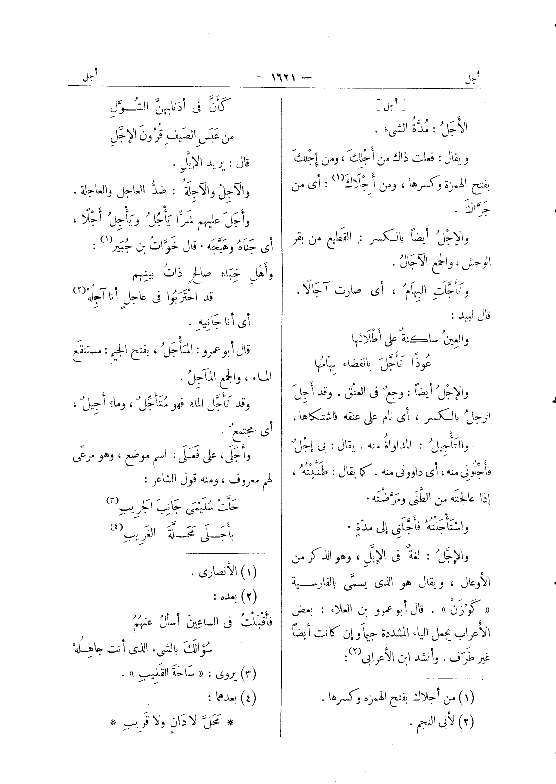[أجل] الاجل: مدة الشئ. ويقال: فعلت ذاك من أَجْلِكَ، ومن إجلك بفتح الهمزة وكسرها، ومن أَجْلاَكَ (¬1) ، أي من جَرَّاكَ. والإجْلُ أيضاً بالكسر: القَطيع من بقر الوحش، والجمع الآجالُ. وتَأَجَّلَتِ البِهامُ، أي صارت آجالاً. قال لبيد: والعينُ ساكنةٌ على أَطْلائها عوذاً تَأَجَّلَ بالفضاء بِهامُها والإجْلُ أيضاً: وجعٌ في العنقُ. وقد أَجِلَ الرجل بالكسر، أي نام على عنقه فاشتكاها والتَأجيلُ: المداواةُ منه. يقال: بي إجْلٌ فأَجَّلوني منه، أي داوونى منه. كما يقال: طنيته، إذا عالجته من الطنى ومرضته. واستأجلته فأجلني جلنى إلى مدةٍ. والإجَّلُ: لغةٌ في الإِيَّلِ، وهوالذ كر من الاوعال، ويقال هو الذي يسمى بالفارسية " كوزن ". قال أبو عمرو بن العلاء: بعض الاعراب يجعل اليإ المشددة جيما وإن كانت أيضا غير طرف. وأنشد ابن الاعرابي (¬2)