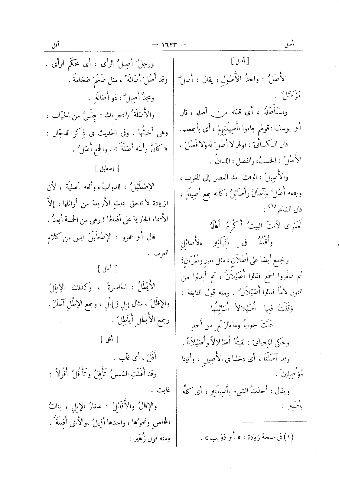 [أصل] الأَصْلُ: واحدُ الأُصولِ، يقال: أصْلٌ مُؤَصَّلٌ. واسْتَأْصَلَهُ، أي قلعَه من أصله، قال أبو يوسف: قولهم جاءوا بأَصيلَتِهِمْ، أي بأجمعهم. قال الكسائيّ: قولهم لا أَصْلَ له ولا فَضْلَ، الأَصْلُ: الحسبُ، والفصل: اللسانُ. والأَصيلُ: الوقت بعد العصر إلى المغرب، وجمعه أُصُلٌ وآصال وأصائل، كأنه جمع أصيلة، قال الشاعر (¬1) : لعمري لأنتَ البيتُ أُكْرِمُ أَهْلَهُ وأَقْعُدُ في أَفْيائِهِ بالأصائِلِ. ويجمع أيضاً على أصلان، مثل بعير وعران، ثم صغروا الجمع فقالوا أُصَيْلانٌ ثم أبدلوا من النون لا ما فقالوا أصيلال. ومنه قول النابغة: وقفت أصيلالا أسائلها عيب جوابا وما بالربع من أحدِ وحكى اللِحيانيّ: لقيتُهُ أُصَيْلالاً وأُصَيْلاناً. وقد آصَلْنا، أي دخلنا في الأصِيلِ، وأتينا مُؤْصلينَ. ويقال: أخذت الشئ بأصيلته، أي كله بأصله.