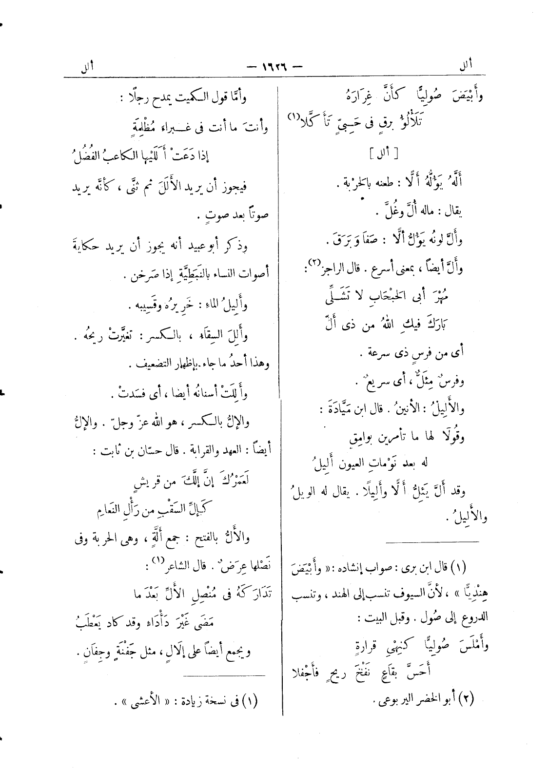 وأما قول الكميت يمدح رجلا: وأنت ما أنت في غبراء مضلمة إذا دعت ألليها الكاعب الفضل فيجوز أن يريد الالل ثم ثنى، كأنه يريد صوتا بعد صوت. وذكر أبو عبيد أنه يجوز أن يريد حكاية أصوات النساء بالنبطية إذا صرخن. وأليل الماء: خَريرُهُ وقَسيبه. وأَلِلَ السِقاءُ، بالكسر: تغيرت ريحه. وهذا أحد ما جاء بأظهار التضعيف. وأللت أسنانه أيضاً، أي فَسَدتْ. والإِلُّ بالكسر، هو الله عزّ وجلّ. والإلُّ أيضا: العهد والقرابة. قال حسان بن ثابت: لعمرك إن إلك من قريش كإل السقب من رأل النعام والال بالفتح: جمع أَلَّةٍ، وهي الحربة وفي نصْلها عِرَضٌ. قال الشاعر (¬1) : تَدارَكَهُ في مُنْصِلِ الأَلِّ بَعْدَ ما مَضى غَيْرَ دَأْداءٍ وقد كادَ يَعْطَبُ ويجمع أيضاً على إلالٍ، مثل جفنة وجفان.