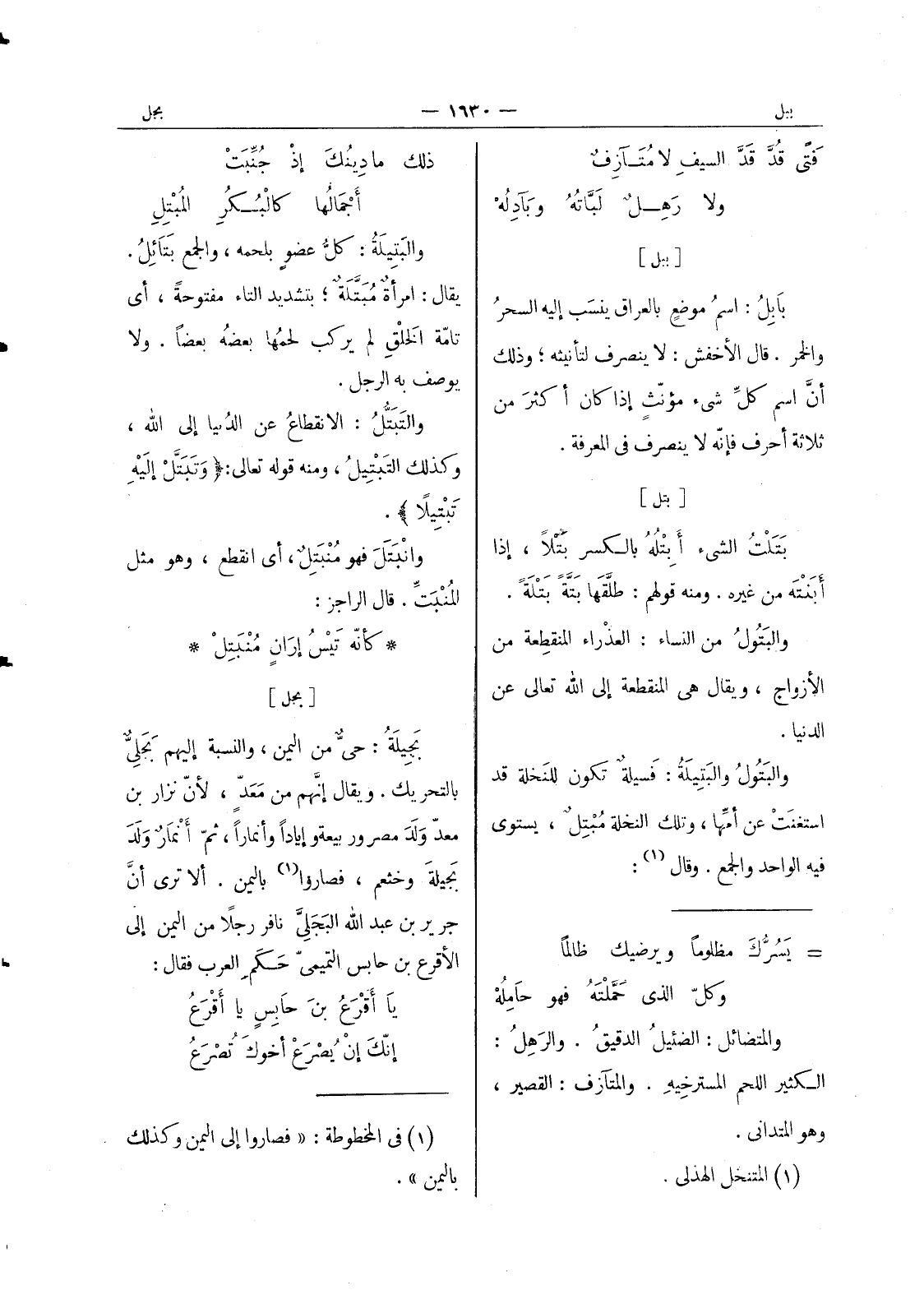 [بجل] بجيلة: حى من اليمن، والنسبة إليهم بجلى بالتحريك. ويقال إنهم من معد، لان نزار بن معد ولد مصرور بيعة وإيادا وأنمارا، ثم أنمار ولد بجيلة وخثعم، فصاروا (¬1) باليمن. ألا ترى أن جرير بن عبد الله البجلى نافر رجلا من اليمن إلى الاقرع بن حابس التميمي حكم العرب فقال: يا أقرع بن حابس يا أقرع إنك إن يصرع أخوك تصرع