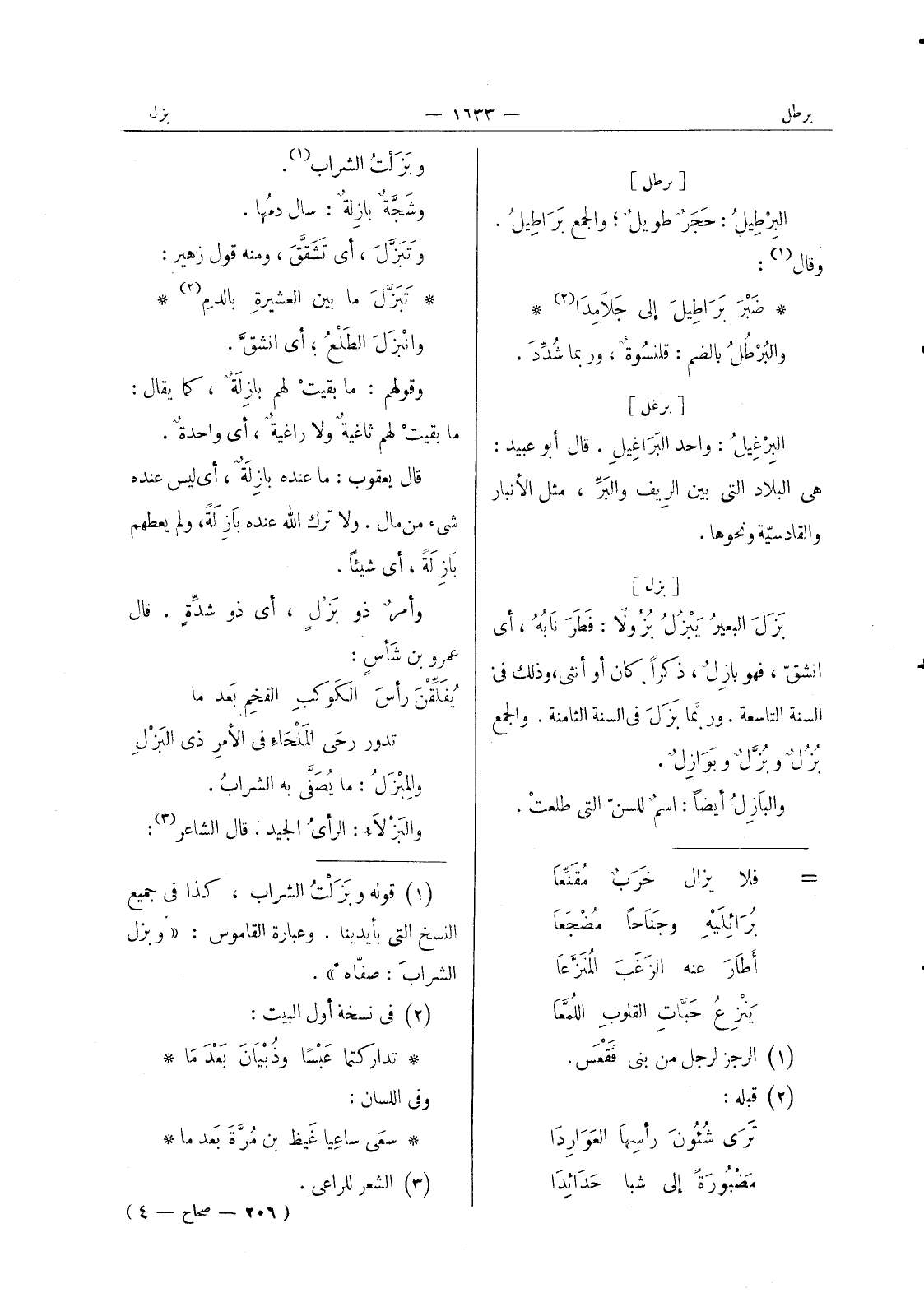 تَبَزَّل ما بين العشيرة بالدم (¬2) * وانبزل الطلع، أي انشق. وقولهم: ما بقيت لهم بازلة، كما يقال: ما بقيت لهم ثاغية ولاراغية، أي واحدة. قال يعقوب: ما عنده بازلة، أي ليس عنده شئ من مال. ولا ترك الله عنده بازِلَةً، ولم يعطهم بازِلَةً، أي شيئاً. وأمرٌ ذو بَزْلٍ، أي ذو شدِّةٍ. قال عمرو بن شَاْسٍ: يُفَلِّقْنَ رأسَ الكوكبِ الفخمِ بَعد ما تدور رحى المَلْحاءِ في الأمرِ ذي البَزْلِ والمِبْزَلُ: ما يُصَفَّى به الشرابُ. والبَزْلاءُ: الرأيُ الجيد. قال الشاعر (¬3)